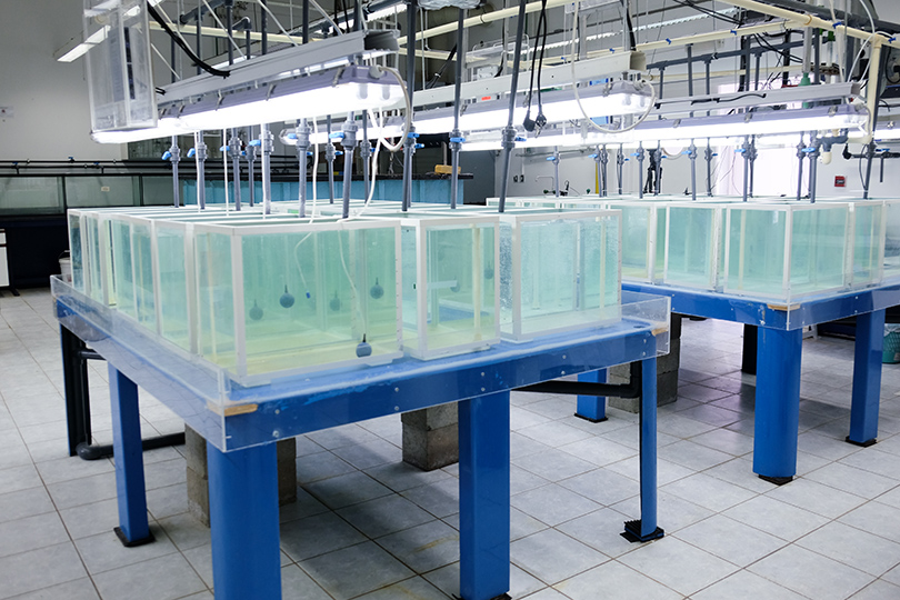 This picture shows the experimental tanks for the ocean acidification – ocean warming exposure experiments. This is a unique set-up to simulate past and future oceanic conditions. Different scenarios are simulated by lowering pH by bubbling of CO2, and regulating temperature using thermostats.