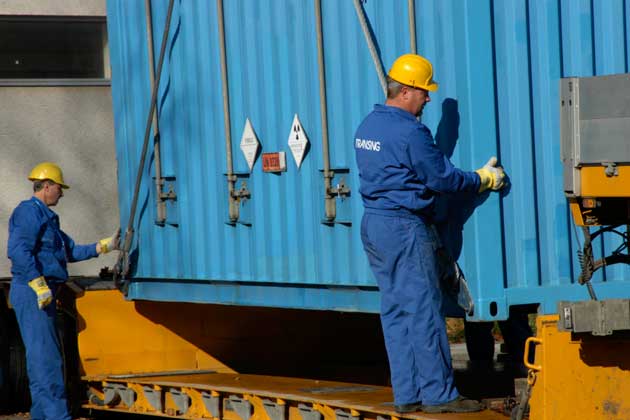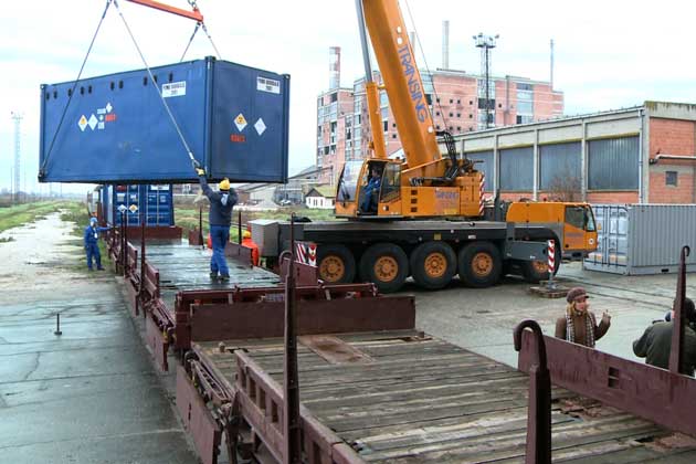Crews unload the containers onto railcars again for the last leg of the journey to Russia’s reprocessing facility at Mayak, where still-usable uranium will be separated for use in nuclear power plant fuel.