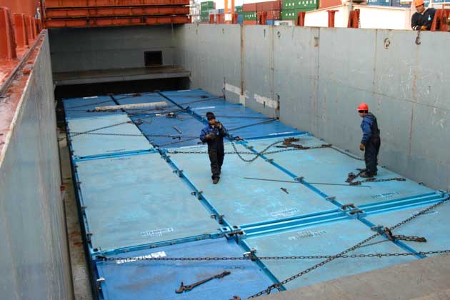 Crew members secure the cargo after the final container has been loaded.