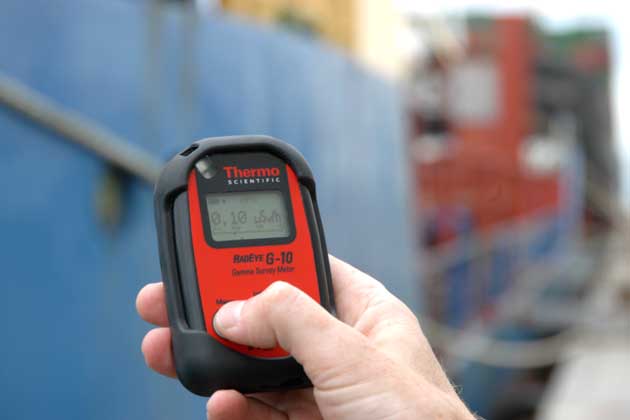 A crew member makes a final radiation check — only background radiation is detected.