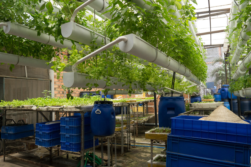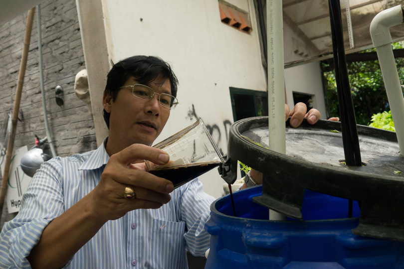 (Photo: Biologist Le Quang Luan adds oligochitosan to a water distribution system for plants in a greenhouse)