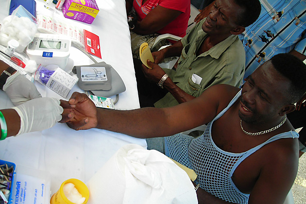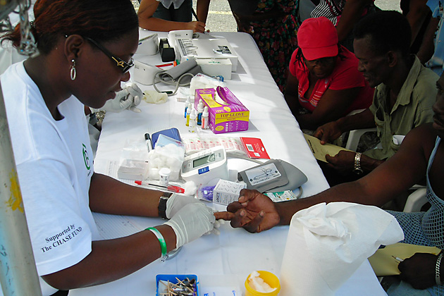 A man in Drewsland gets his blood lead level checked during a community outreach event organised by ICENS and sponsored by the CHASE Foundation. For the last 10 years the Jamaican government has been involved in funding and encouraging research on lead, through its agencies-the Environmental Foundation of Jamaica, the CHASE Foundation and ICENS. State health inspectors helped locate backyard lead smelters and were instrumental in educating communities about the dangers of lead.