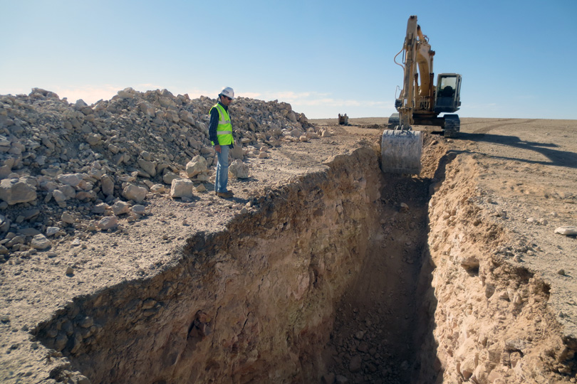 Identifying and extracting uranium resources can be a challenge, especially in areas that have not been previously investigated. Excavating a large trench as part of an assessment of a uranium deposit for a possible future mining site in Central Jordan. Photo Credit P. Woods / IAEA