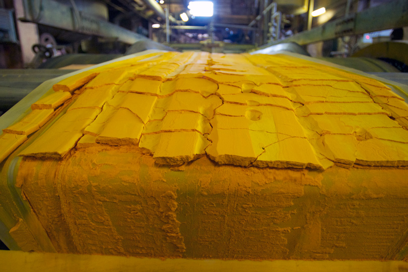 The result is uranium ore concentrate, 'yellow cake', an often but not always yellow powder of uranium oxide, peroxide or similar. In the yellow cake, the uranium concentration has been raised to more than 75%. Seen here is yellow cake coming off a conveyor line in a uranium mill. Photo Credit Areva