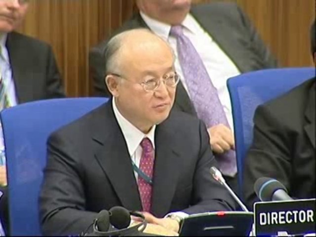 IAEA Director General Yukiya Amano discusses nuclear technology and cancer control at the March 2010 Board of Governors meeting.