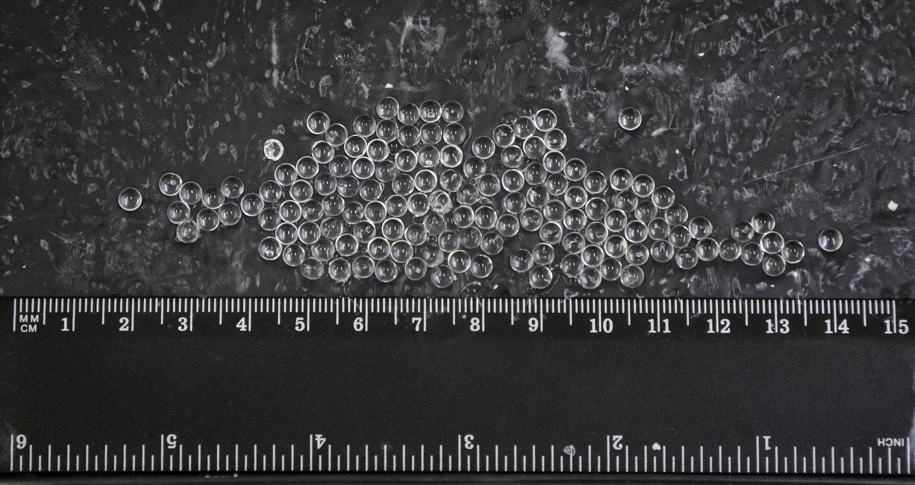 Image of pellets made at JINR-Dubna and used to moderate fast neutrons (left), and the schematic representation of their molecular structure. (Photo: JINR Dubna)