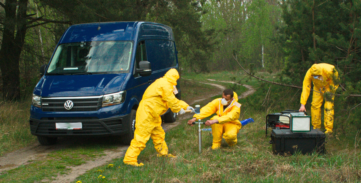 The mobile laboratory is capable of off-road operations and serves as a work platform for a crew of four in the field. It is equipped with a portable air sampling device, a handheld gamma-spectrometer, a radiation monitor for environmental sample measurements, a soil sampling kit, personal protection garments, navigation and communication tools, an electric generator and a workplace with a computer and other appliances.