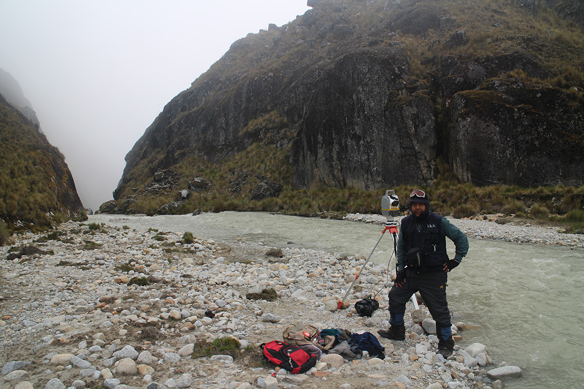 Edson Ramirez measuring morphometric changes in water rivers in basins with glacier coverage in Nevado Illampu, Cordillera Real (Bolivia).&nbsp;(Photo: Abraham Machaca)