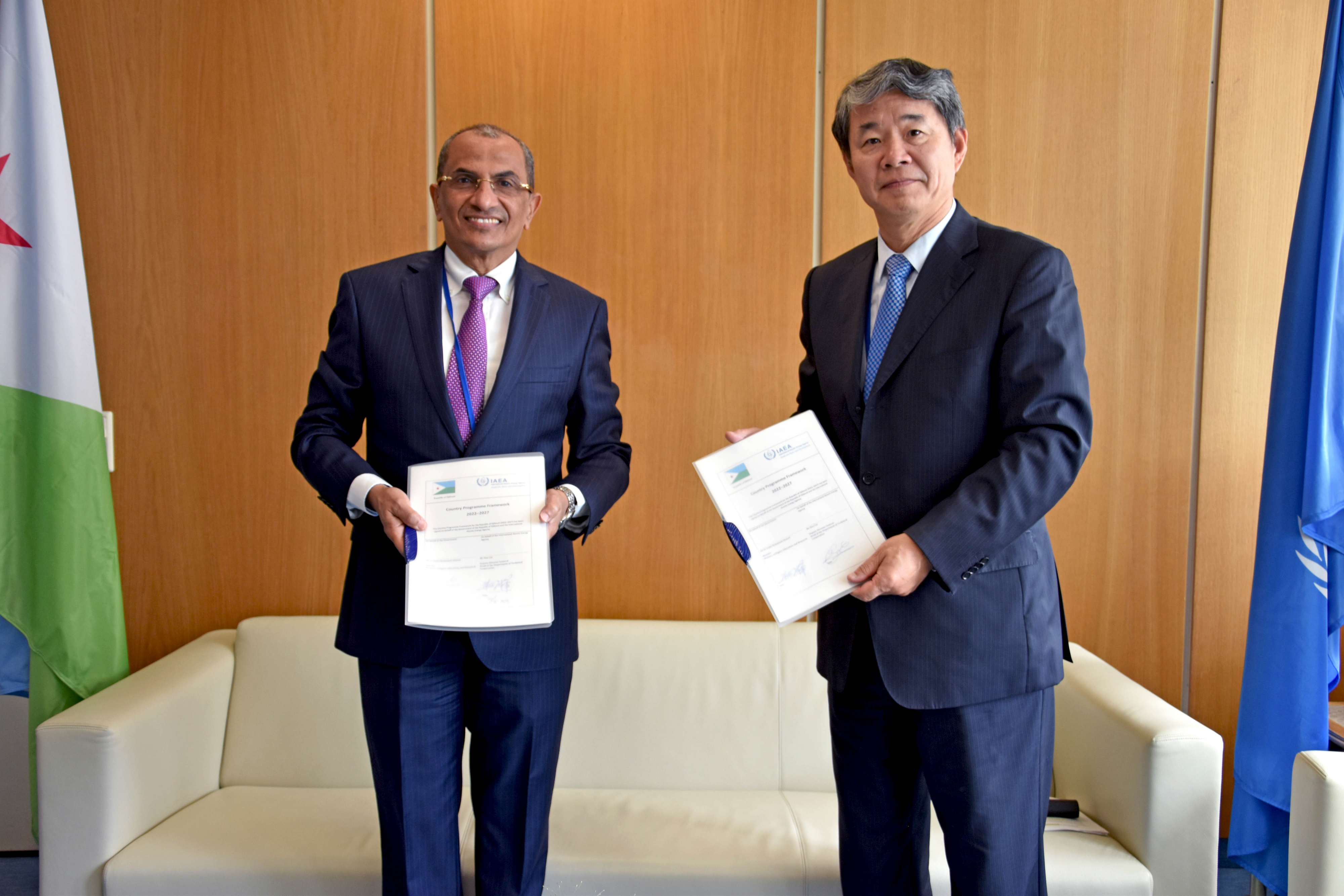 Dr Nabil Mohamed Ahmed, Minister of Higher Education and Research, and Hua Liu, IAEA Deputy Director General and Head of the Department of Technical Cooperation, signed Djibouti’s Country Programme Framework (CPF) for the period of 2022–2027 on 20 September. A CPF is the frame of reference for the medium-term planning of technical cooperation between a Member State and the IAEA and identifies priority areas where the transfer of nuclear technology and technical cooperation resources will be directed to support national development goals.