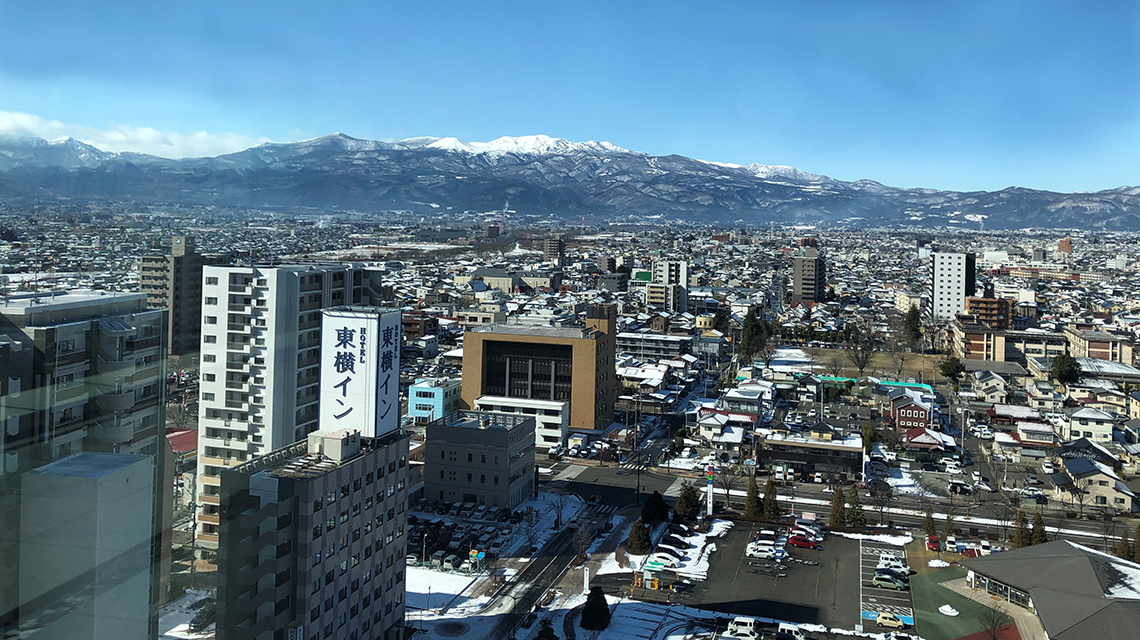 Fukushima City, in front of snow capped peaks, on a&nbsp;sunny afternoon in 2020. Life in most of Fukushima Prefecture has returned to normal, thanks - in part - to joint work by Prefecture authorities and the IAEA. (Photo: M. Gaspar/IAEA)