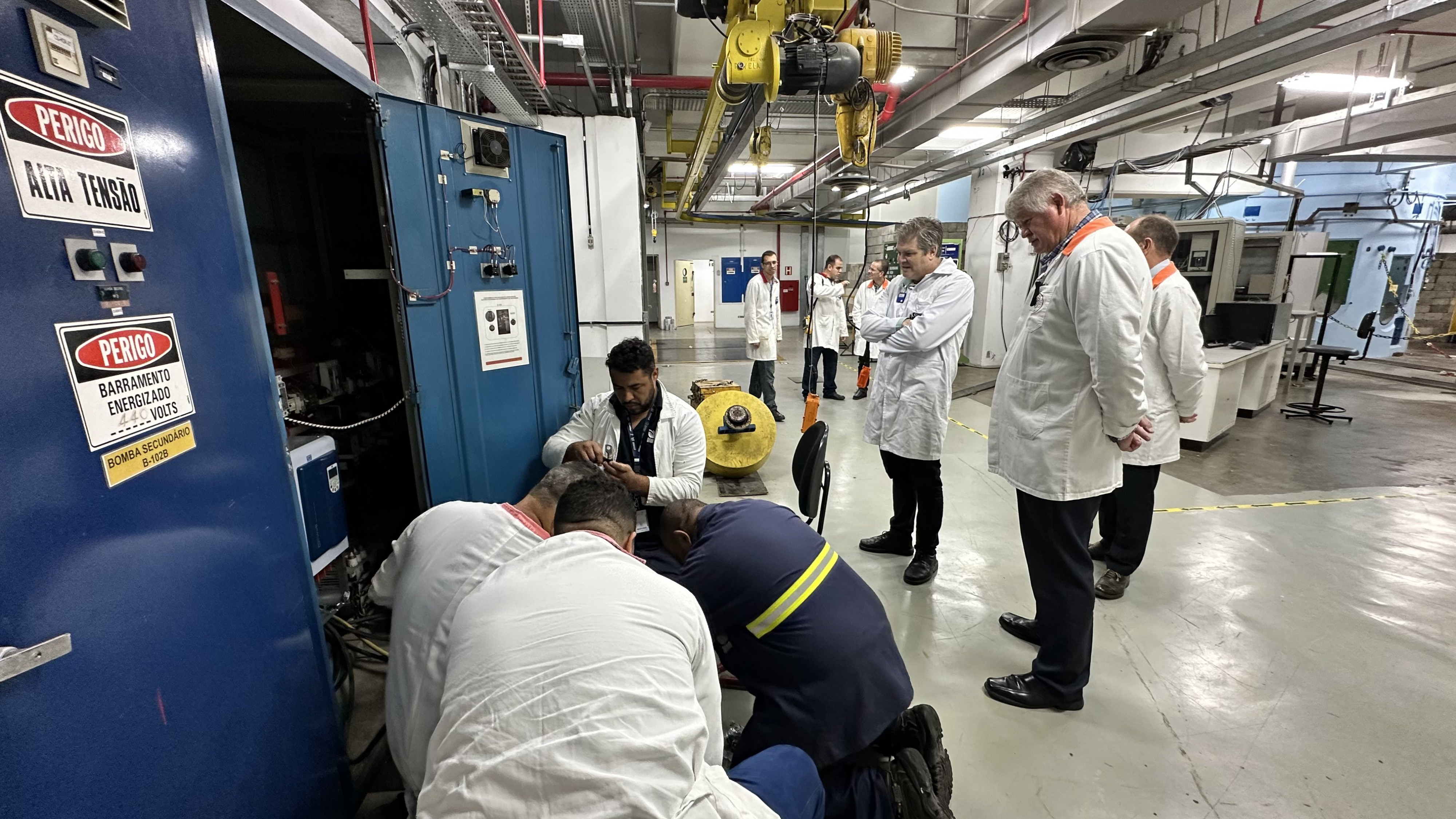 The OMARR mission team observes electrical panel work being done to recommence reactor operations (Photo: R. Mazzi/IAEA)