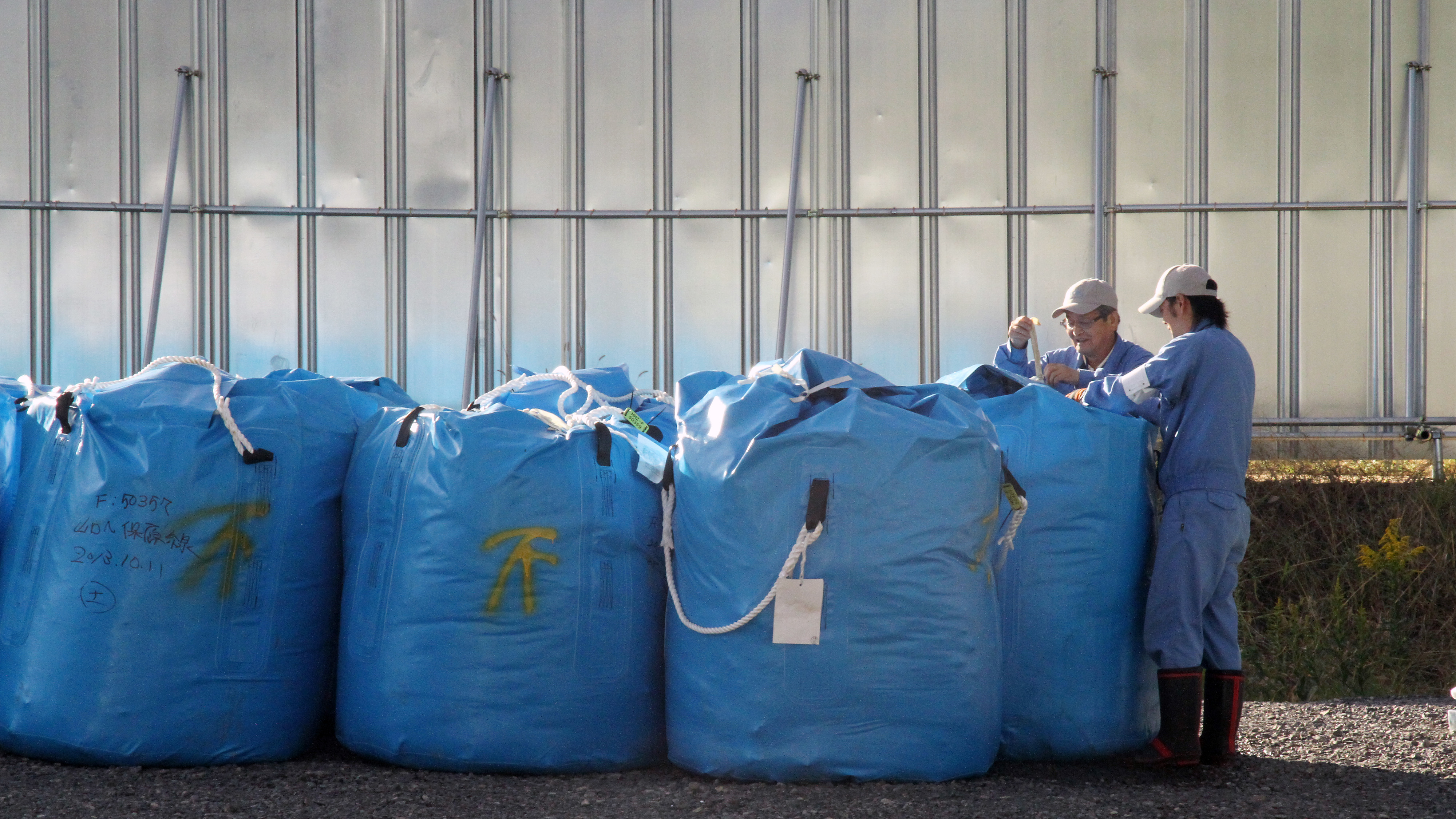 Remediation workers check bags of soil and other decontamination waste at a temporary storage site in Date city in Fukushima Prefecture, Japan. (Photo: G. Tudor/IAEA)