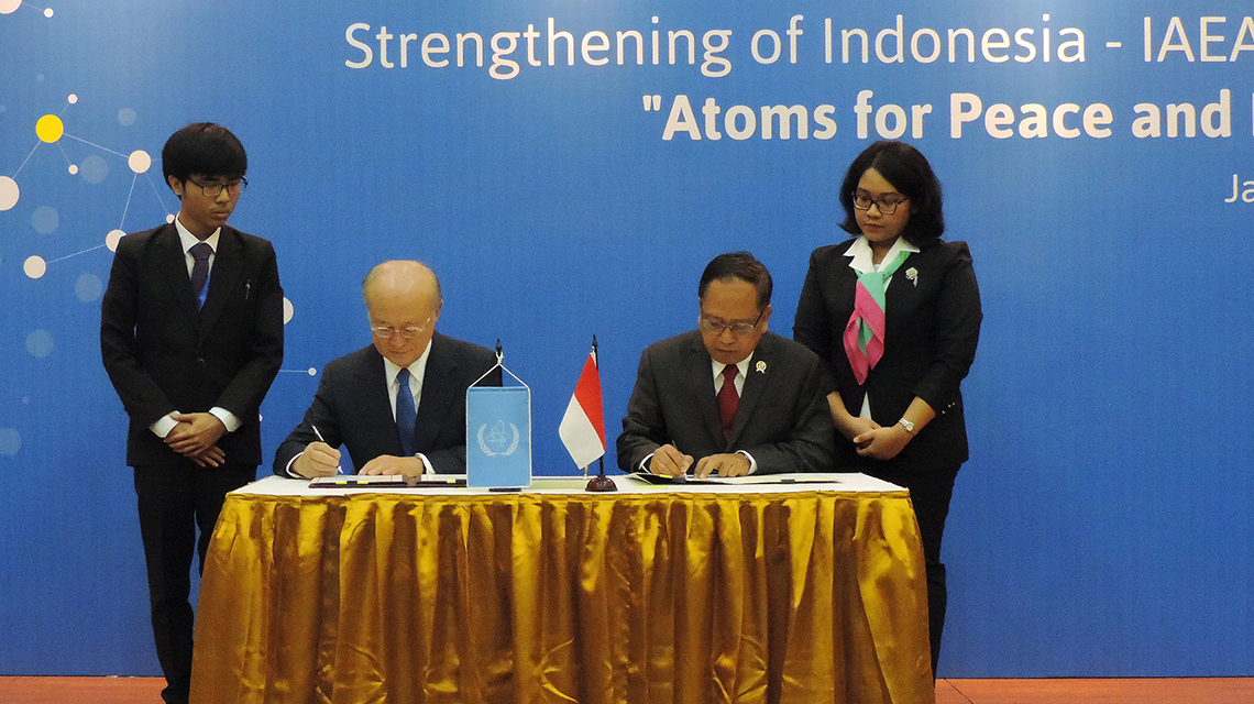 Mr Amano also noted the ongoing cooperation to help meeting Indonesia’s development goals. He highlighted the various projects in which nuclear technology is benefitting the country, including improving child nutrition, mitigating climate change, protecting the environment, reducing air pollution and production of radioisotopes for radiotherapy use.