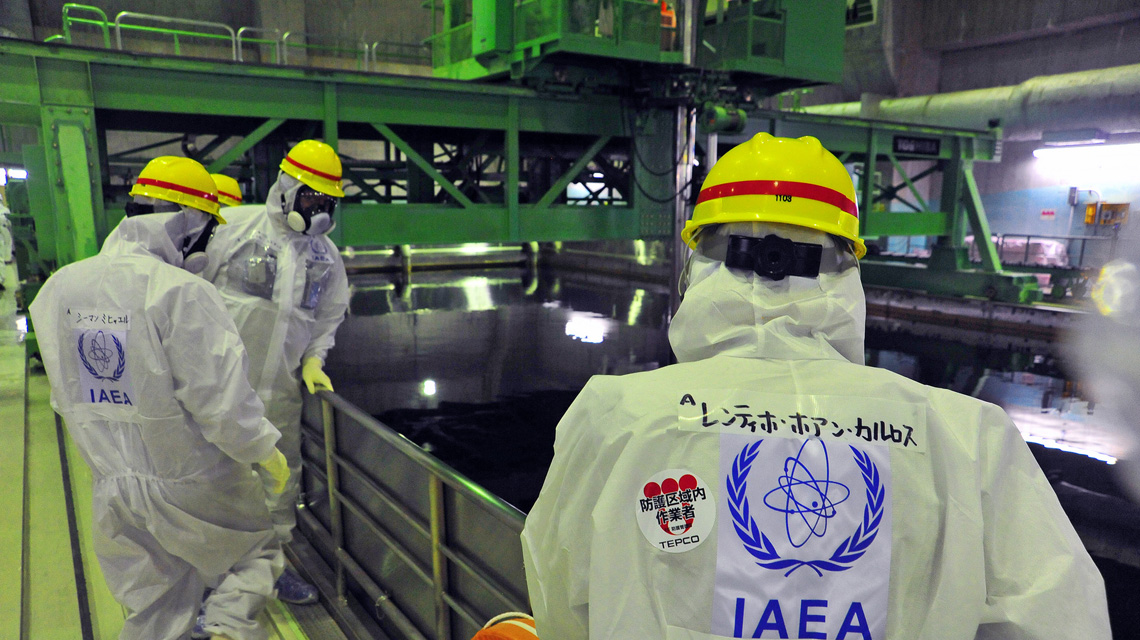IAEA decommissioning team leader Juan Carlos Lentijo (right) peers into the Common Spent Fuel Pool at the Fukushima Daiichi Nuclear Power Station during a November 2013 IAEA expert review of Japanese efforts to decommission the damaged nuclear power plant. (Photo: G. Webb/IAEA)
