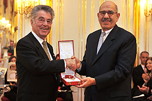 On 4 December 2009 in Vienna, Austria, at the Presidential Palace, the Austrian Federal President, Dr. Heinz Fischer, conferred the Grand Decoration of Honour in Gold with Sash, one of the Republic′s highest honours, upon IAEA Director General Emeritus, Dr. Mohamed ElBaradei.