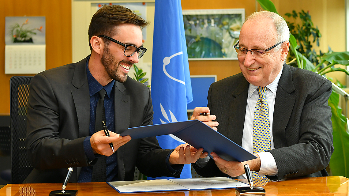 Aldo Malavasi, Deputy Director General and Head of the IAEA&nbsp;Department of Nuclear Sciences and Applications (right) and Juliano Cerci, President of the Brazil-based&nbsp;Sociedade Brasileira de Medicina Nuclear sign the practical arrangement on 18 July 2018. (Photo: D. Calma/IAEA)