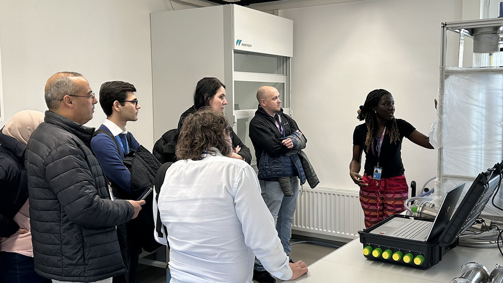 Hannah Affum demonstrating how radiotracers help to understand flow processes to a group of scientists in the IAEA’s radiotracer laboratory. (Photo: S. Liu/IAEA)