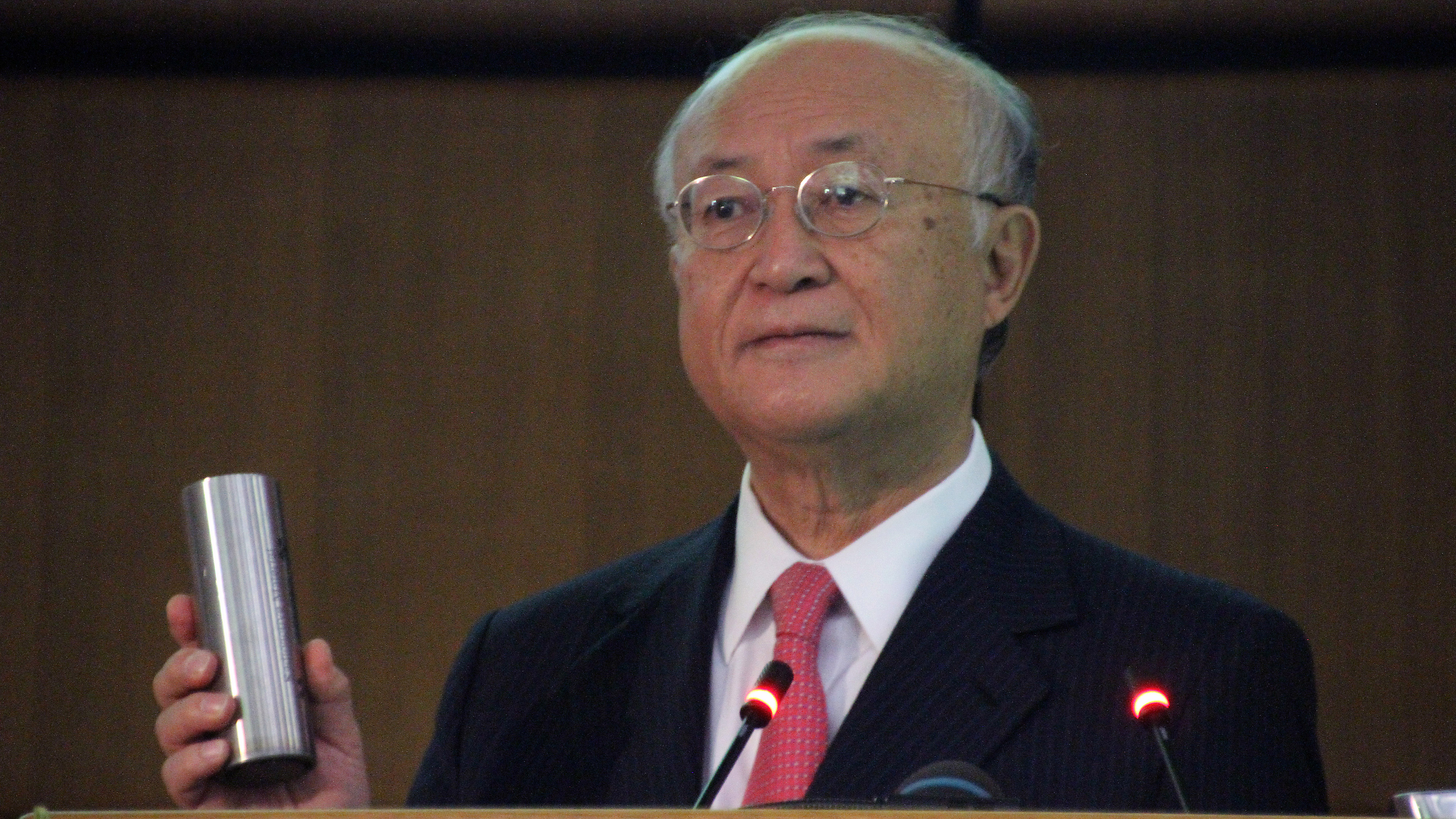 Showing a stainless steel capsule used for conditioning disused sealed radioactive sources, which would have been used in medical, food, construction and other industries, IAEA Director General Amano emphasizes that radioactive waste is an issue for all States. (Photo: A. Evrensel/IAEA)&nbsp;
