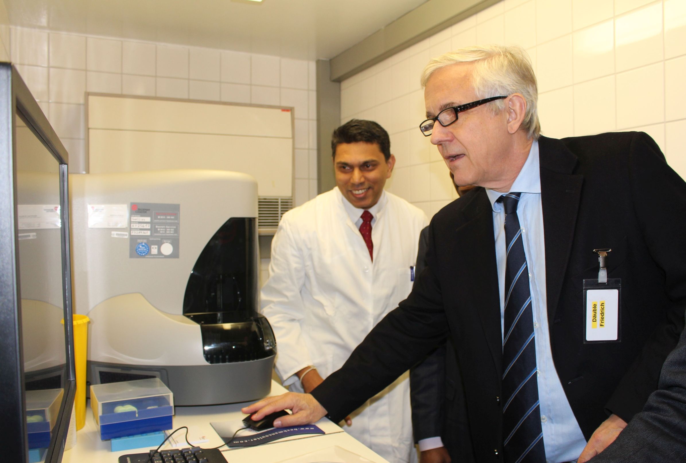 The German Ambassador, His Excellency Mr. Friedrich D?uble, switches on the flow cytometer at Seibersdorf.