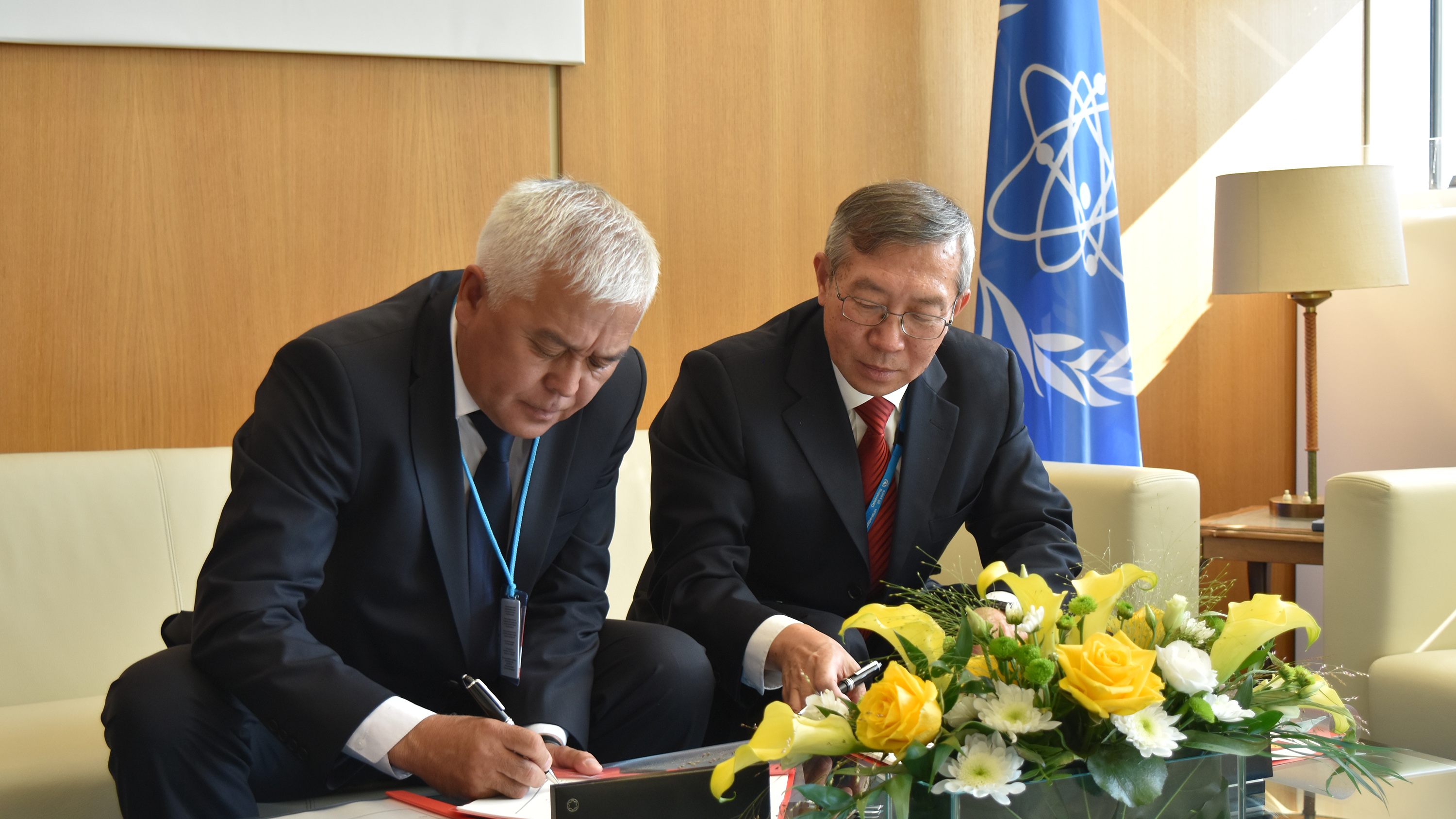 Mr Abdykalyk Rustamov, Director of the State Agency on Environment Protection and Forestry under the Government of the Kyrgyz Republic, and Mr Dazhu Yang, IAEA Deputy Director General and Head of the Department of Technical Cooperation.  (photo C.Karle/IAEA)