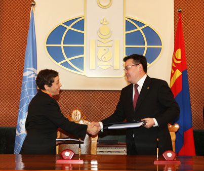 Mongolia signed its United Nations Development Assistance Framework (UNDAF) agreement for 2012-2016 on 17 March 2011. The ceremony was held in the capital, Ulaanbaatar, at the Ministry of Foreign Affairs and Trade. The document was co-signed by H.E. Mr. Gombojav Zandanshatar, Minister of Foreign Affairs and Trade of Mongolia, Ms. Sezin Sinanoglu, UN Resident Coordinator and UNDP Resident Representative in Mongolia, and 12 participating UN organizations. Mr Dazhu Yang, the Director of the Division of Asia and the Pacific, signed the UNDAF document on behalf of the IAEA.