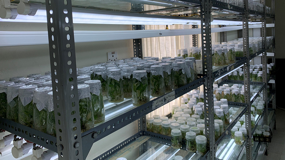 Irradiated ginger mutant lines are under development and observation in the growth room, which was upgraded with support from the IAEA and FAO. (Photo: Scientific Research Council of Jamaica)