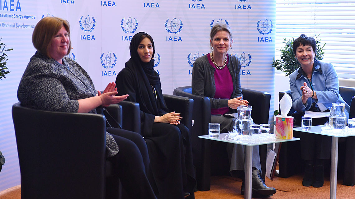 (From left to right): Lisa Kepinski, Founder and Director of the Inclusion Institute, Amani Al Hosani, Deputy Simulations Manager at the Nawah Energy Company, Helen Eduards, Sweden’s ambassador to international organizations in Vienna and IAEA Deputy Director General and Head of the Department of Management Mary Alice Hayward at the panel discussion to mark International Women’s Day. (Photo: D. Calma/IAEA)