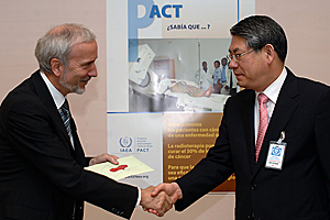 Accepting the cheque on behalf of PACT, Werner Burkart, IAEA Deputy Director General for Nuclear Applications and Sciences, pointed out that development in low-income countries is resulting in extended life expectancy and, at the same time, greater exposure to lifestyle factors that increase the risk of cancer. "We must work with these countries now to fight the threatening cancer epidemic," he said. "In its support of PACT, Korea has taken a leading role. We hope that other Member States consider following Korea′s very important example."