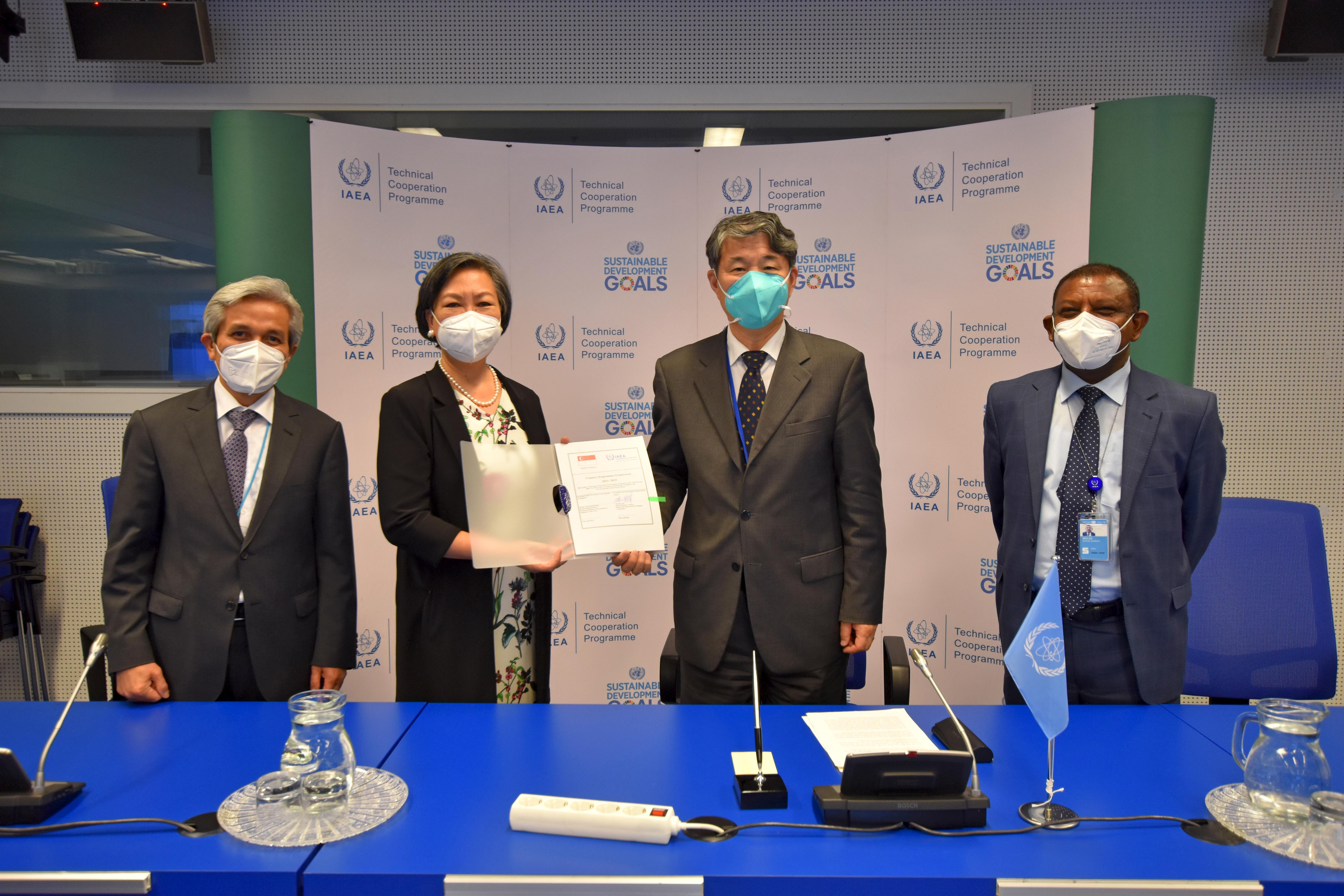 Hua Liu, IAEA Deputy Director General and Head of the Department of Technical Cooperation, is joined by Jane Gerardo-Abaya, Director of the Technical Cooperation Division for Asia and the Pacific (TCAP), and by Gashaw Wolde, a Section Head in TCAP, in presenting the&nbsp;signed&nbsp;Singapore Country Programme Framework (CPF) for the period of 2021–2025. (Photo: O. Yusuf/IAEA)