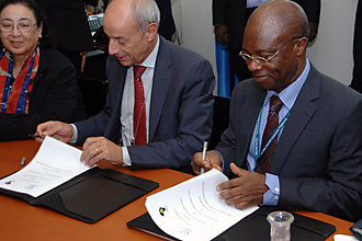 Denis Flory, IAEA Deputy Director General for Nuclear Safety (left), and Augustin Simo, FNRBA Chairperson, concluded the agreement on 17 September 2013 during the 57th IAEA General Conference. (Photo: O. Yusuf/IAEA)