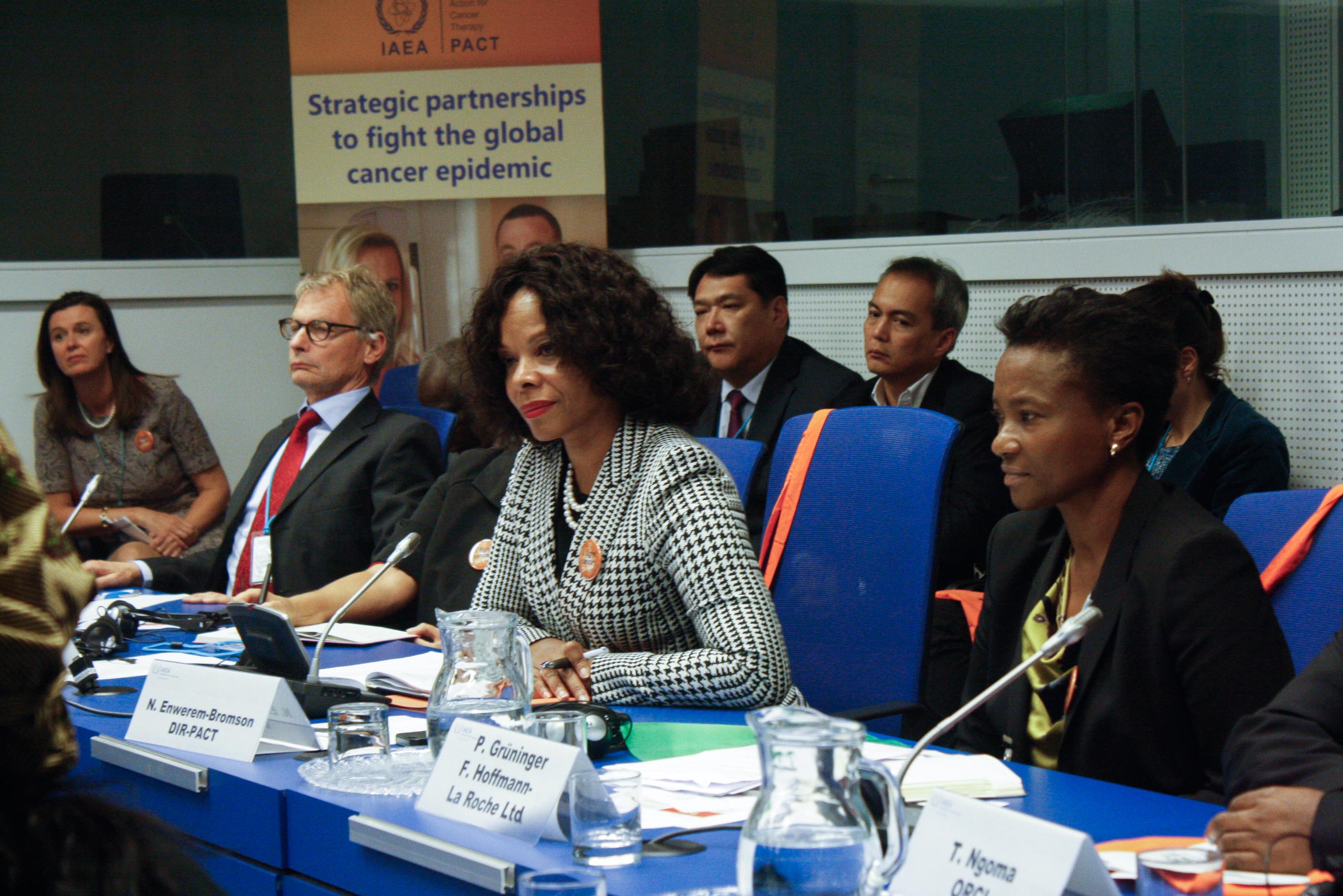 IAEA Deputy Director General and Head of the Department of Technical Cooperation, Kwaku Aning, introduced the panel members: Ambassador Mitsuru Kitano of Japan, Ambassador Tebogo Seokolo of South Africa, Ambassador Hernán Estrada Román of Nicaragua, Rachid Bencherif, Head of the Grants Unit, OPEC Fund for International Development, Peggy Grueninger, Head, Corporate Donations and Philanthropy at Roche African Research Foundation; Twalib A. Ngoma, Executive Director, Ocean Road Cancer Institute, Tanzania; Julie Torode, Deputy CEO and Director of Advocacy for the Union of International Cancer Control (UICC), and Andreas Ullrich, Medical Officer, Cancer Control of the World Health Organization (WHO).