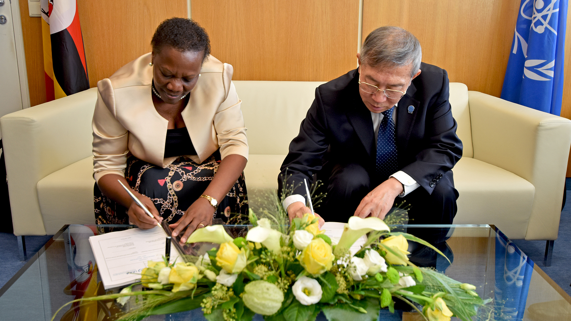Irene Muloni, Minister of Energy and Mineral Development, and Dazhu Yang, IAEA Deputy Director General and Head of the Department of Technical Cooperation, signing&nbsp;Uganda’s Country Programme Framework (CPF) for the period of 2019–2023. (Photo: O. Yusuf/IAEA)