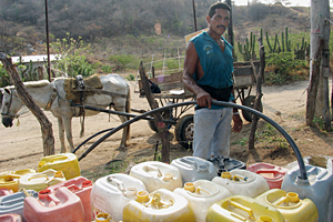 A delivery man fills plastic containers with water from wells tapped into the Morroa aquifer. (Morroa, Colombia, March 2005). (Photo: Ana Gabarick)