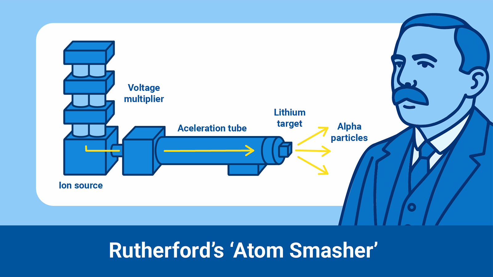 Rutherford’s discovery led to the development of the first particle accelerator, initially referred to as an ‘atom smasher’. This powerful machine could accelerate charged particles using an electrical field to high energies along a path and used strong magnets to create beams of single charged particles. When the fast-moving particles hit the target (they could go almost as fast as the speed of light), the atoms in the target split apart.