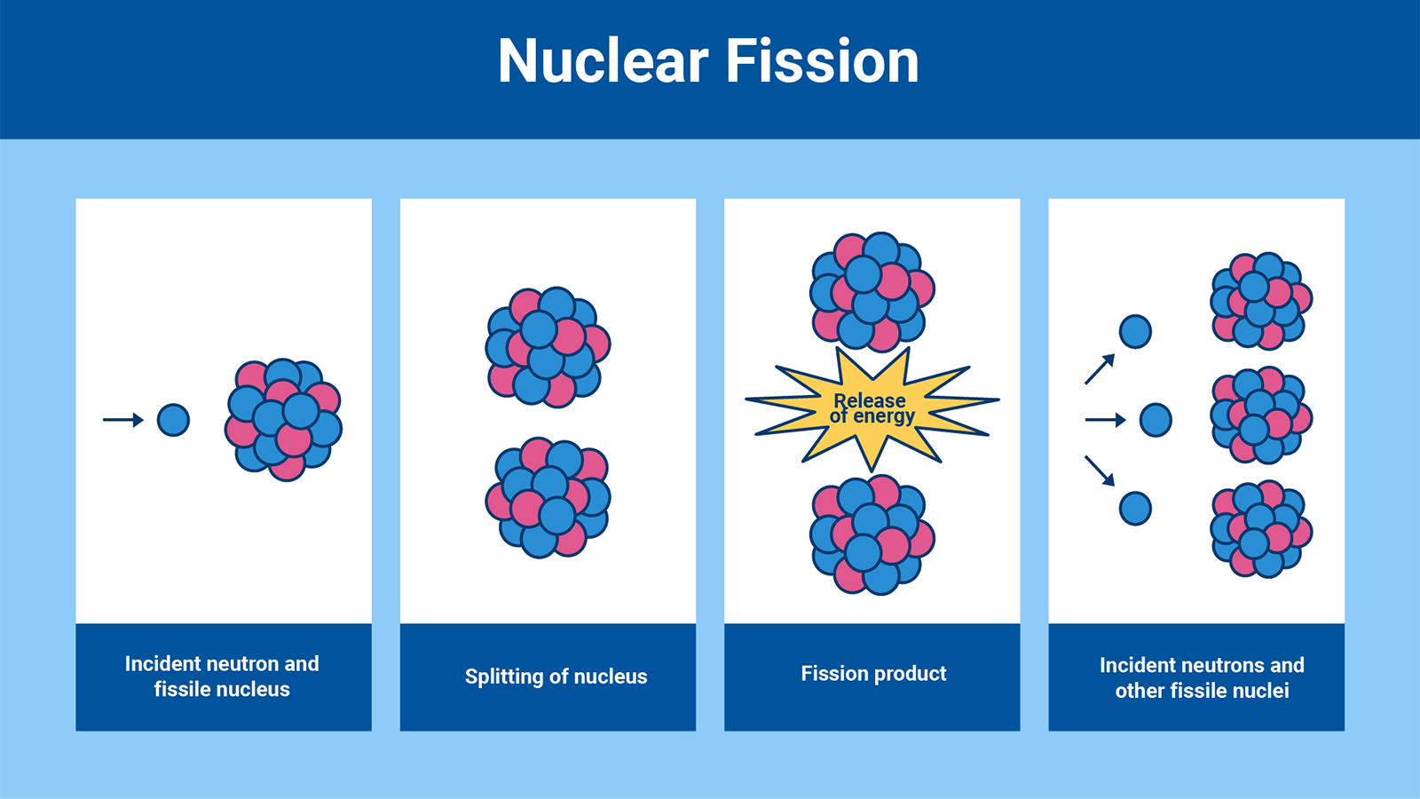 Fission can be used to create a nuclear chain reaction. Every time a uranium-235 atom is split it releases on average 2.5 neutrons. These can go on to split further fissile nuclei, releasing yet more neutrons. However, these ‘fast’ neutrons initially travel with too much energy to be effective at causing fission. Using a ‘moderator’ such as water or graphite slows down the neutrons. The neutrons lose most of their energy in collisions with the hydrogen or carbon atoms to become ‘thermal’ or ‘slow’ neutrons which have a much better chance of splitting other uranium nuclei.