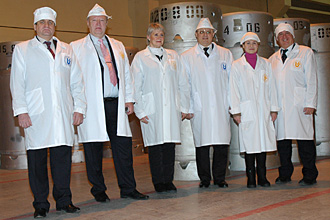 Dignitaries attending the inauguration ceremony of the LEU Reserve at the International Uranium Enrichment Center, Angarsk, Russian Federation, gather for the group photograph: (from left to right) Alexander Belousov, Director, Angarsk Electrolytic Chemical Combine; Alexey Lebedev, General Director, International Uranium Enrichment Center; Marina Belyaeva, Rosatom; Ambassador Grigory Berdennikov, Russian Governor, Russian Federation, IAEA Board of Governors; Nadia Kozlova, Rosatom; and Alan McDonald, IAEA Department of Nuclear Energy.