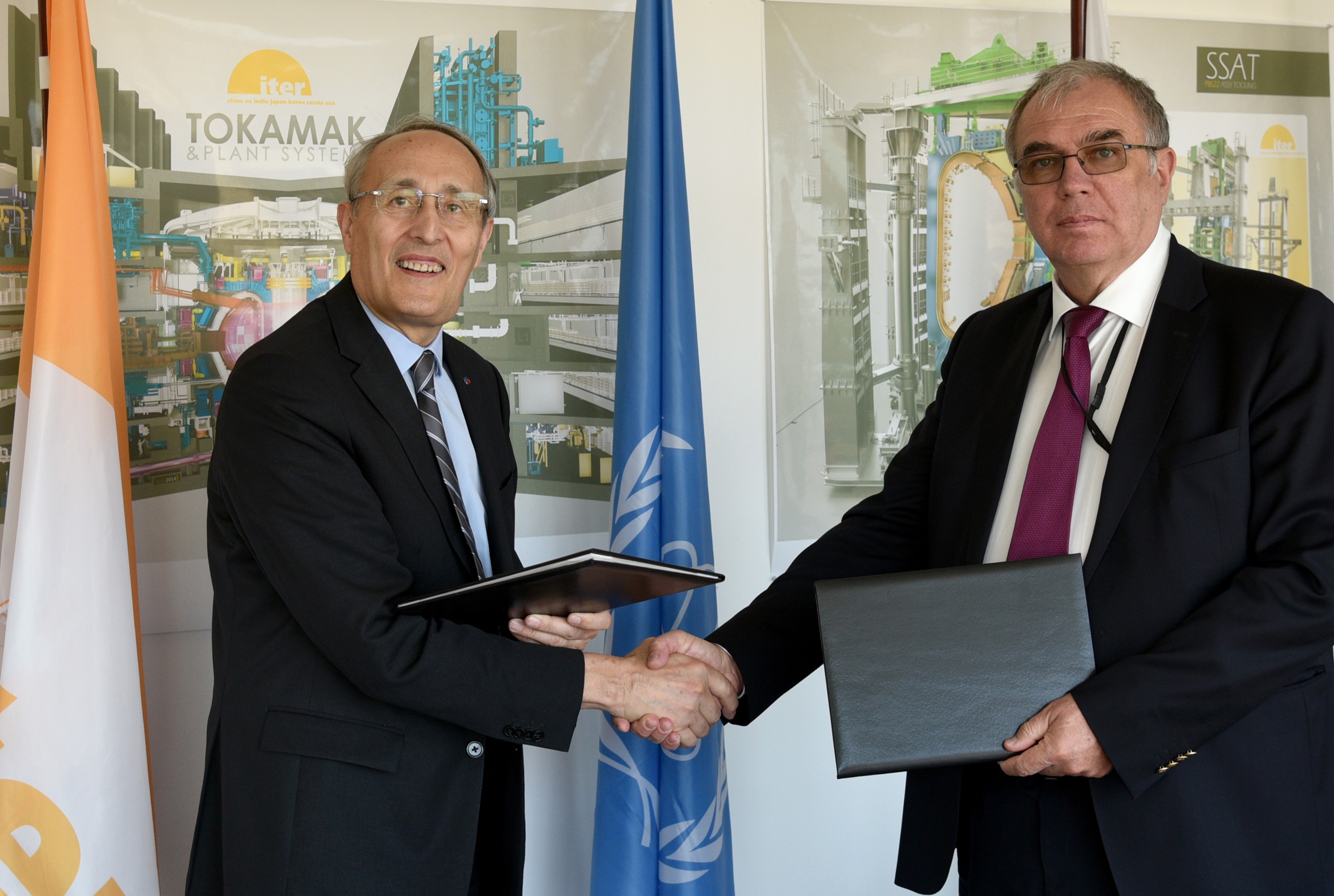 IAEA Assistant Director General and Chief Coordinator Cornel Feru?? signed the agreement known as Practical Arrangements at the IAEA’s headquarters in Vienna this week. Mikhail Chudakov, IAEA Deputy Director General and Head of the Department of Nuclear Energy, who attended the 24th meeting of the ITER Council representing the IAEA, handed over the Practical Arrangements to ITER Organization Director-General Bernard Bigot at ITER’s headquarters in St. Paul-lez-Durance, France. The agreements that went into effect with Mr Bigot signing today expand and deepen a cooperation agreement from 2008.