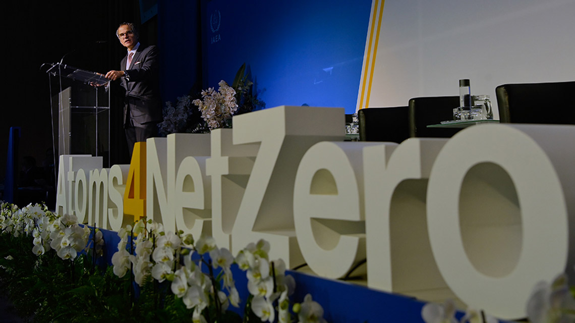 IAEA Director General Rafael Mariano Grossi delivers his statement at the Second International Conference on Climate Change and the role of Nuclear Power 2023: Atoms4NetZero, being held in Vienna, Austria this week. (Photo: D. Calma/IAEA)
