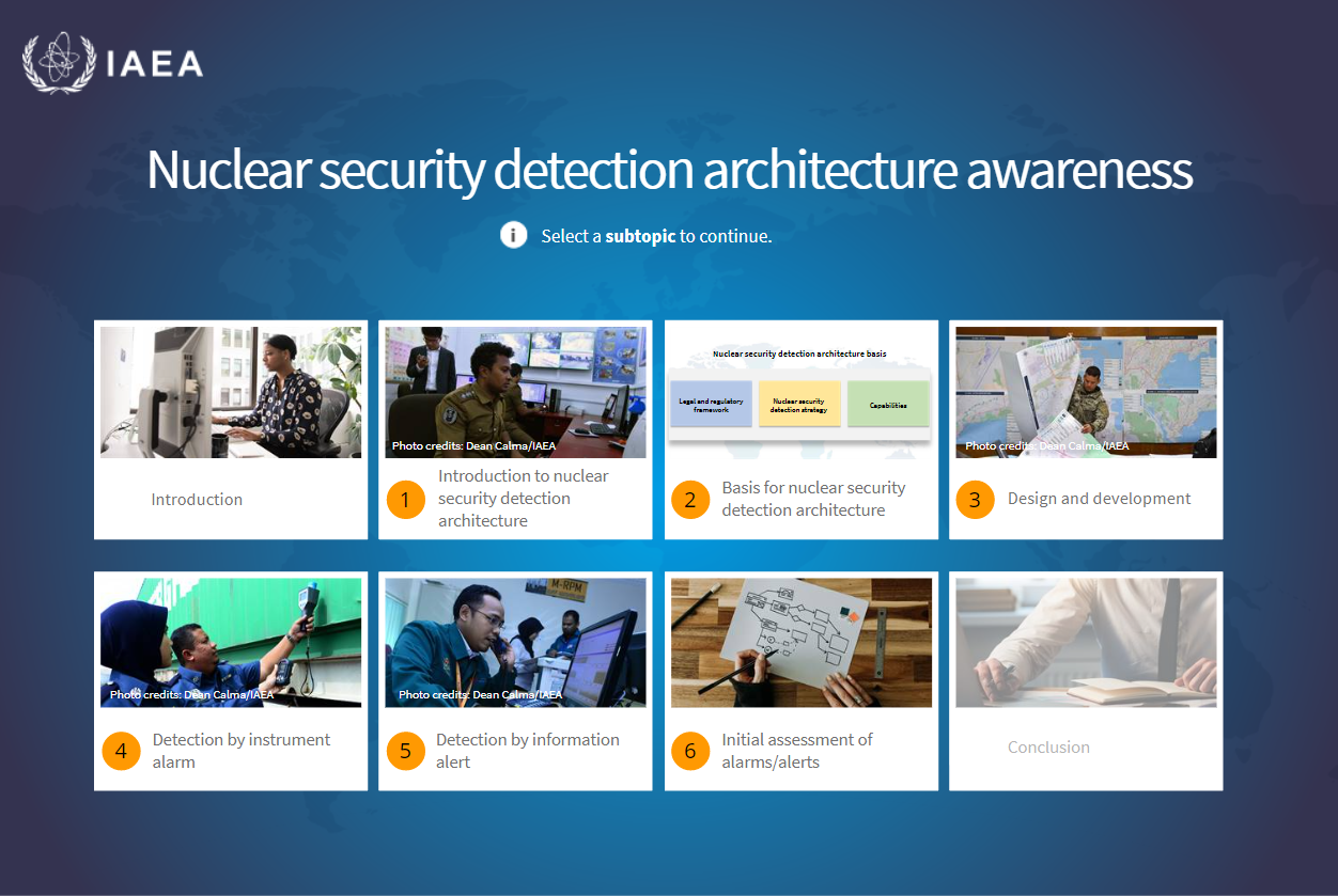 This e-learning module is designed to provide basic awareness on core nuclear security detection architecture concepts including:? Understanding the scope and framework of a national-level NSDA; Developing awareness around core nuclear security detection architecture concepts; Understanding the need for coordination and cooperation among key stakeholders at all levels with the aim of contributing to nuclear security risk assessment; national level detection strategy; inventory or existing capabilities and resources; and national level concept of operations for detection. ?????? ????? ??????? ??? ???????? ???????? ????? ????? ?? ???? ????? ??????? ??? ?? ???:?? ??? ???? ????? ??? NSDA ??? ??????? ??????? ????? ????? ??? ???????? ???????? ????? ????? ?? ???? ????? ??????? ??? ?????? ??? ??????? ???????? ??? ????? ??????? ????????? ??? ???? ?????????. ???? ???????? ?? ????? ????? ????? ?????? ??????????? ????? ??? ??????? ?????? ???????? ?? ?????????? ???????? ??????? ?????? ?????? ????? ??? ??????? ??????. Obtener una concienciación básica sobre los conceptos clave de la arquitectura de detección en seguridad física nuclear (NDSA), lo que incluye: comprensión del alcance y el entorno de una NSDA a nivel nacional; desarrollo de concienciación sobre los conceptos clave de la arquitectura de detección en seguridad física nuclear; comprensión de la necesidad de coordinación y cooperación entre los principales involucrados esen todos los niveles con el fin de contribuir a la evaluación de riesgos para la seguridad física nuclear, a la estrategia de detección a nivel nacional, al inventario o a las capacidades y recursos existentes, y al concepto a nivel nacional de las actuaciones encaminadas a la detección. Acquérir une sensibilisation de base aux concepts fondamentaux en matière de l’architecture de détection en matière de sécurité nucléaire, notamment : Comprendre le champ d’application et le cadre d’une architecture de détection en matière de sécurité nucléaire au niveau national; Développer la sensibilisation aux concepts fondamentaux de l’architecture de détection en matière de sécurité nucléaire; Comprendre la nécessité de la coordination et de la coopération entre les principales parties prenantes à tous les niveaux afin de contribuer à l’évaluation des risques liés à la sécurité nucléaire ; à la stratégie de détection au niveau national ; à l’inventaire des capacités et des ressources actuelles ; et au concept opérationnel de la détection au niveau national. Получить базовые знания об основных концепциях архитектуры обнаружения событий, связанных с физической ядерной безопасностью, в том числе: понять содержание и область применения архитектуры обнаружения событий, связанных с физической ядерной безопасностью на национальном уровне; получить знания об основных концепциях архитектуры обнаружения событий, связанных с физической ядерной безопасностью; понять необходимость координации и сотрудничества между ключевыми заинтересованными сторонами на всех уровнях с целью внесения вклада в оценку риска для физической ядерной безопасности; стратегию обнаружения на национальном уровне; материально-технические ресурсы или существующие средства и ресурсы; принципы организации работ по обнаружению на национальном уровне. 對核安保偵查架構的核心概念形成基本認識,包括:了解國家層面 NSDA 的范圍和框架; 大致了解核安保偵查架構的核心概念; 了解各級主要利益相關者之間進行協調與合作的必要性。 目的是便于進行核安保風險評價;制定國家層面的偵查戰略;了解存量或現有能力與資源;以及制定國家層面的偵查行動計劃。The audience for this course is intended to include all senior level personnel responsible for the national policy, strategy, planning, design, implementation, and evaluation of a nuclear security detection architecture and involved in: National security; Customs and border security; Law enforcement; Operational information and analysis; Legal and regulatory framework; Technical support organizations; Any other competent authority responsible for nuclear security. ???? ???????? ????????? ?? ????? ??????????? ?????? ?????? ?????? ?????? ???? ????? ?? ???? ????? ?????? ??? ??????? ?????? ?????????? ??:? ????? ?????? ; ??????? ?????? ????? ???????? ????? ????? ????????? ????????? ????????? ?????????? ???? ????? ???????? ?????????? ?????? ????? ??????? ?? ???? ????? ???? ?????? ?? ????? ??????. Personal de alto nivel responsable de la política nacional, la estrategia, la planificación, el dise?o, la implementación y la evaluación de una arquitectura de detección en seguridad física nuclear, involucrado en: seguridad nacional; seguridad en aduanas y fronteras; cuerpos y fuerzas de seguridad del Estado; información y análisis operacionales; marco legal y reglamentario; organizaciones de asistencia técnica; cualquier otra autoridad competente con responsabilidades de seguridad física nuclear. Personnel responsable de la politique nationale, de la stratégie, de la planification, de la conception, de la mise en ?uvre et de l’évaluation d’une architecture de détection en matière de sécurité nucléaire et participant aux domaines suivants : Sécurité nationale ; Douanes