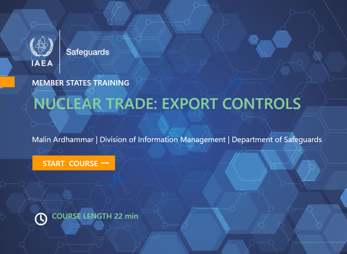 Course Objective:Ever wondered how nuclear trade export controls work? Nuclear Trade analyst Malin Ardhammar walks participants through how international safeguards and export controls are connected, the main reporting obligations under legal frameworks, the main features of the international regime governing export controls of nuclear material and related equipment, as well as the key elements of a domestic export control system.First released in January 2022.Duration: 25-30 mins?/?Level: Fundamentals/?Interactivity: Self-Study /?Languages: English /?Certificate: no Certificate availablesafeguards-training