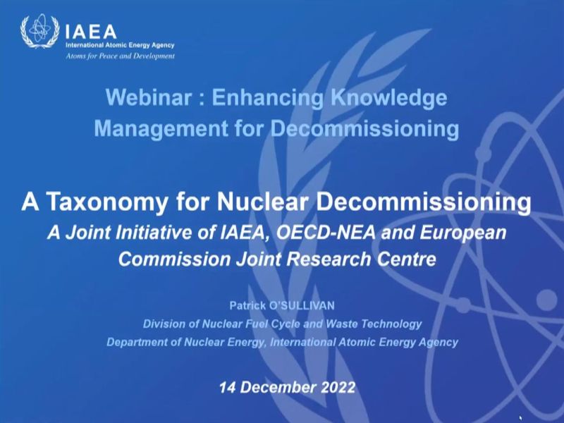 This webinar, focusing on current good practice in the development of systems to organize knowledge for decommissioning of nuclear facilities, will be the 22nd in the series of the IAEA Back End Wednesday Webinars. International experts will discuss current approaches at project level to organize knowledge in support of scenario planning, inventory records, stakeholder engagement and project management for decommissioning. International initiatives will also be discussed, including the IAEA Nuclear Wiki and the current joint initiative of the IAEA, OECD Nuclear Energy Agency and the European Commission to develop a standard taxonomy for nuclear decommissioning.After attending this webinar, participants will have an increased understanding of:Current approaches to organization of knowledge to support the planning and implementation of decommissioning projects.The emerging role of digital technologies in facilitating data management for decommissioning.Approaches to developing ageing management programmes.Knowledge management in support of stakeholder engagement.