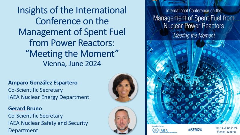 Today more than 400 nuclear power reactors supply over 10% of the world’s total electricity and a quarter of all low-carbon power playing a key role in the world’s low-carbon energy mix.Approximately 10 000 tonnes of spent nuclear fuel (SNF) are discharged annually with new forms of spent fuel set to arise, as innovative reactors such as Small Modular and Advanced Reactors (SMR-AMR) come online).Since 1987, the IAEA gathers the community of operators, researchers, regulators, decision makers and other experts focused on this relevant undertaking providing a forum for the exchange of information on national SNF management strategies and on how the management of spent fuel will support the role that nuclear energy could play in a changing energy mix.The last edition of the IAEA International Conference on the Management of Spent Fuel from Nuclear Power Reactors, with the theme “Meeting the Moment”, held in June 2024, was attended by around 300 participants from 58 Member States and 6 International Organizations. It was organized in-cooperation with the OECD/NEA, the WNA, the EC and the WNTI.This Webinar aims at providing an overview of the main discussions and topics addressed as well as the main takeaways and conclusions from the IAEA International Conference on the Management of Spent Fuel from Nuclear Power Reactors: Meeting the Moment.