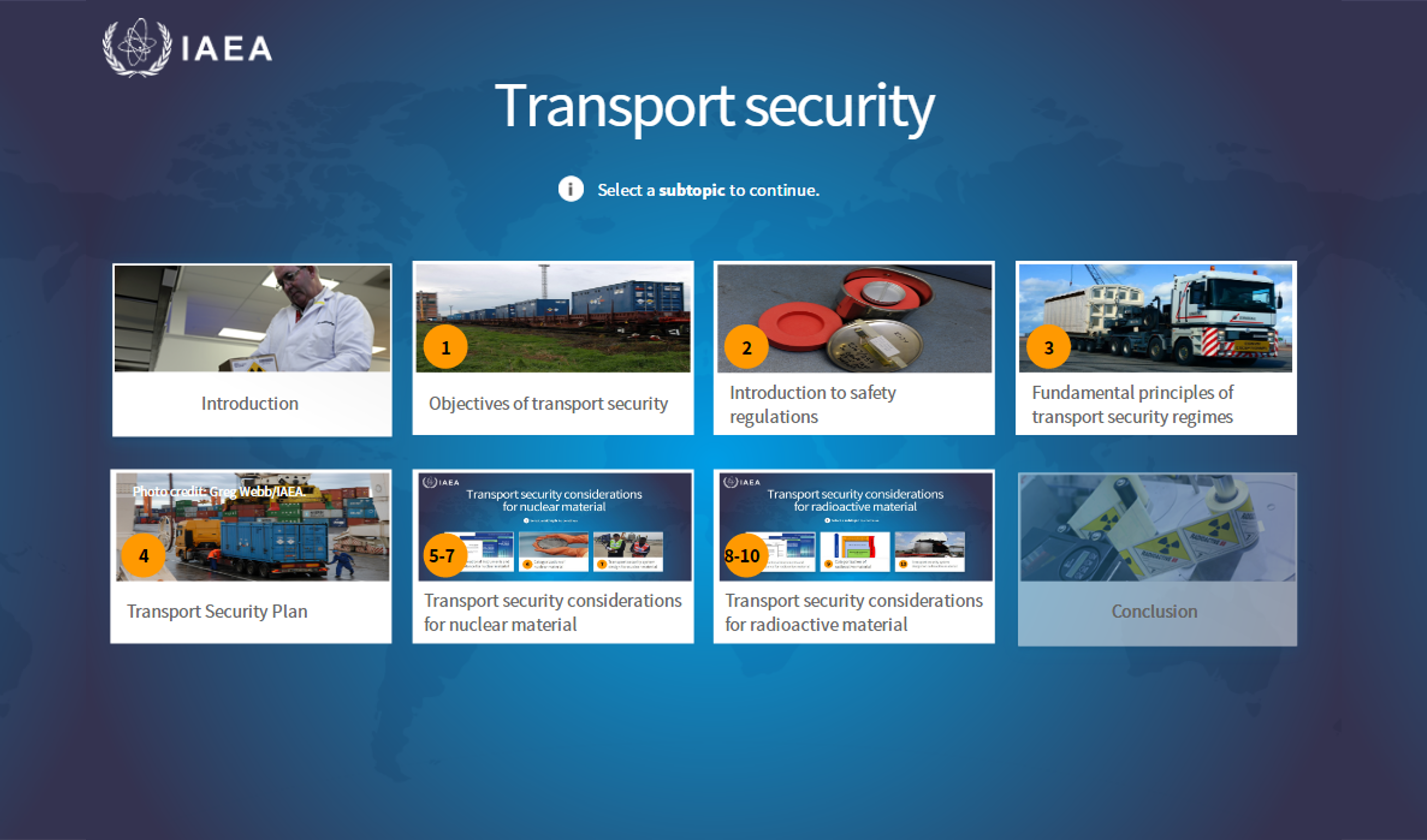 This course is based on IAEA guidance documents and provides an introduction to the basic principles of transport security. This course will look at how to ensure nuclear and radioactive material is transported safely and securely. ????? ??? ?????? ????????? ??? ??????? ????????? ??????? ?? IAEA? ??? ???? ????? ??? ??????? ???????? ???? ?????. ??? ?????? ??? ?????? ????????? ????? ???? ??? ?????? ??????? ??????? ?????? ?????? ?????? ?????. Este curso está basado en documentos orientativos del OIEA y proporciona una introducción a los principios básicos de seguridad física en el transporte. En este curso analizaremos cómo garantizar tanto la seguridad física como la seguridad tecnológica en el transporte de materiales nucleares y de otros materiales radiactivos. Cette formation est fondée sur les guides de l’AIEA et fournit une introduction aux principes fondamentaux de la sécurité du transport. Elle aborde la fa?on de garantir le transport en toute s?reté et en toute sécurité des matières nucléaires et radioactives. Данный курс основан на руководствах МАГАТЭ и содержит вводную информацию об основных принципах обеспечения физической безопасности при перевозке. В этом модуле мы рассмотрим правила обеспечения безопасности и физической безопасности ядерных и других радиоактивных материалов при перевозке. 本課程以 IAEA 指導文件為基礎,詳細介紹運輸安保的基本原則。本課程將探討如何確保安全運輸核材料和放射性物質。Participants of face-to-face training and other human resource development activities implemented by the IAEA and its Member-States. Interested nuclear facility personnel and the public.????????? ?? ????????? ??????? ????? ???? ?????? ????? ??????? ??????? ?????? ???? ?????? IAEA ?????? ??????? ???. ???????? ?? ??????? ??????? ???????? ???? ????? ????? ?????. Participantes en cursos de formación presencial y en otras actividades de formación de recursos humanos implementados por el OIEA y por sus Estados miembros. Personal de instalaciones nucleares y público en general interesado en la materia.Personnes participant aux formations présentielles et autres activités de développement des ressources humaines mises en ?uvre par l’AIEA et ses états membres. Personnel des installations nucléaires et public intéressés.Данный курс предназначен для участников очного обучения и других мероприятий по развитию кадрового потенциала, реализуемых МАГАТЭ и государствами-членами Агентства, а также для заинтересованного персонала ядерных установок и для общественности. IAEA 及其成員國所開展面對面培訓及其他人力資源開發活動的參與者。核設施相關人員和公眾。Duration: 2 h 30 min | Interactivity: Self-study | Languages: English, Arabic, Spanish, French, Russian, Chinese | Certificate: Completion Certificate | Contact: nsnselearning@iaea.org ?????? :?????? ?30 ?????? | ?????? : ???? ???????? ??? ???????? | ?????: ???????? ??????????? ?????????? ????????? ???????? ??????? | ???????: ????? ????? | ???? ???????: nsnselearning@iaea.orgDuración: 2 horas | Interactividad: Autoestudio | Idioma: árabe, inglés, espa?ol, francés, ruso, chino | Certificación: Certificado de participación | Contacto: nsnselearning@iaea.org ??Durée: 2?h?30 | Interactivité: Autoformation | Langue: Arabe, anglais, espagnol, fran?ais, russe, chinois | Certification: Certificat d’achèvement | Point de contact: nsnselearning@iaea.org?Продолжительность: 2?ч. 30?мин. | Интерактивность: Самообучение | Язык: Арабский, английский, испанский, французский, русский, китайский | Сертификация: Сертификат о прохождении | Контактное лицо: nsnselearning@iaea.org ??持續時間: 2 小時 30 分鐘 | 形式: 在線電子學習 | 語言: 阿拉伯語、英語、西班牙語、法語、俄語、中文 | 證書: 結業證書 | 聯系方式: nsnselearning@iaea.orgFull description...?????? ?????????Descripción detallada?Description détaillée?Подробное описание...?詳細說明...?