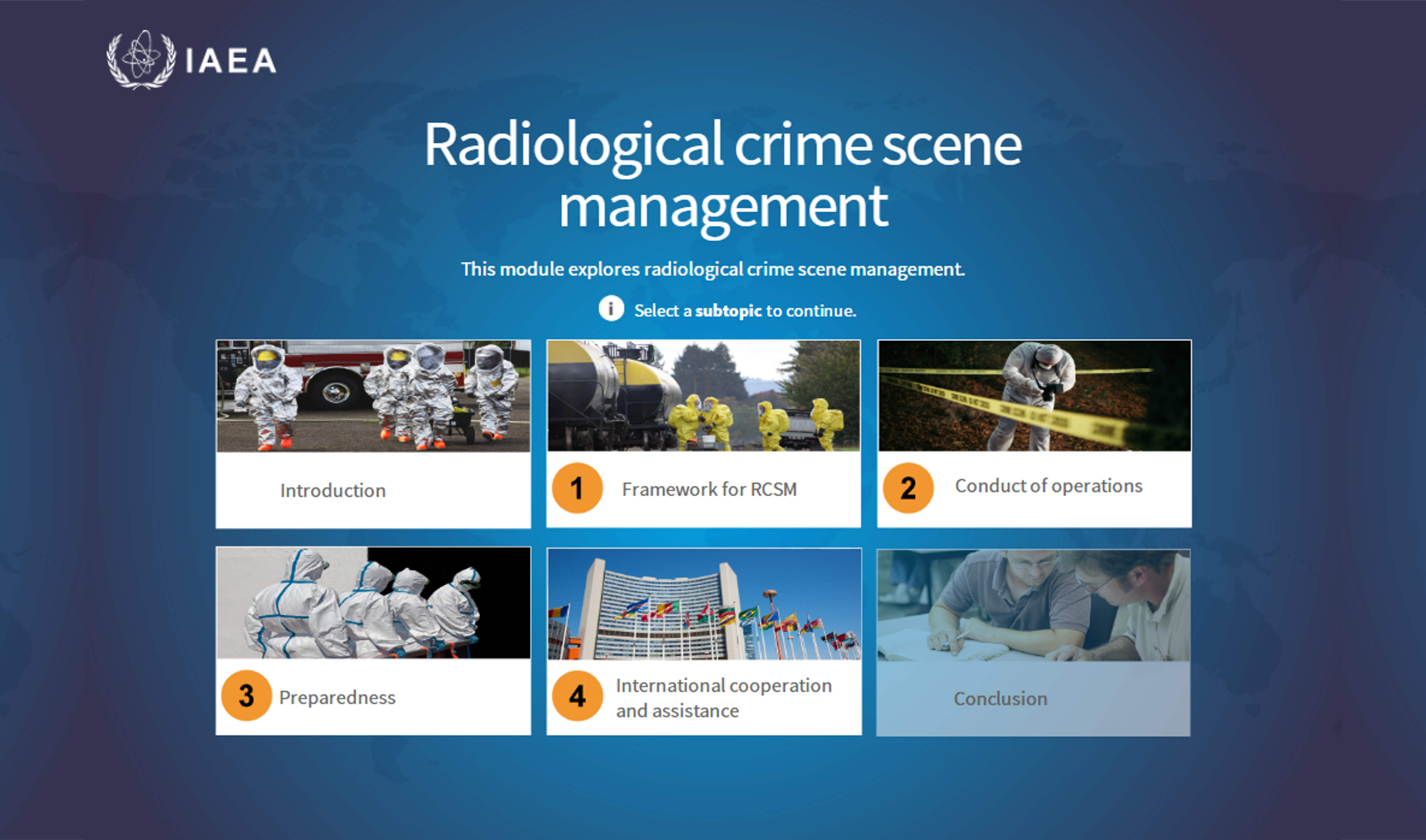 EnrolThis course is based on IAEA guidance documents and provides an introduction to the basic principles of radiological crime scene management. This course examines the process used to ensure safe, secure, effective and efficient operations at a crime scene where nuclear or other radioactive materials are known to be or are suspected of being present. ????? ??? ?????? ????????? ??? ??????? ????????? ??????? ?? IAEA? ??? ???? ????? ??? ??????? ???????? ?????? ???? ??????? ?????????. ?????? ??? ?????? ????????? ??????? ????????? ????? ??? ????? ??????? ?????? ???????? ???? ??? ?? ???? ????? ???? ????? ???? ????? ?? ???? ???? ???? ?? ?? ?????? ?? ??????.Este curso está basado en documentos orientativos del OIEA y proporciona una introducción a los principios básicos de la gestión de escenas de delitos radiológicos. En este curso se examina el proceso utilizado para garantizar que las actuaciones realizadas en la escena de un delito en la que se sepa o sospeche que existe algún material nuclear u otro material radiactivo se desarrollen con eficacia y eficiencia, así como cumpliendo los requisitos de seguridad física y tecnológica. Cette formation est fondée sur les guides de l’AIEA et fournit une introduction aux principes fondamentaux de la gestion des scènes de crime radiologique. Ce module aborde le processus utilisé pour garantir la s?reté, la sécurité, l’efficacité et l’efficience des opérations sur une scène de crime où des matières nucléaires ou autres matières radioactives sont présentes ou susceptibles de l’être. Данный курс основан на руководствах МАГАТЭ и содержит вводную информацию об основных принципах организации работ на месте радиологического преступления. В этом курсе рассматривается процесс, используемый для обеспечения безопасности, надежности, эффективности и результативности операций на месте преступления в тех случаях, когда известно или предполагается, что там находится ядерный или другой радиоактивный материал. 本課程以 IAEA 指導文件為基礎,詳細介紹放射性犯罪現場管理的基本原則。本課程將探討用于確保在已知或疑似存在核材料或其他放射性物質的犯罪現場進行安全、可靠、高效操作的流程。Participants of face-to-face training and other human resource development activities implemented by the IAEA and its Member-States. Interested nuclear facility personnel and the public.????????? ?? ????????? ??????? ????? ???? ?????? ????? ??????? ??????? ?????? ???? ?????? IAEA ?????? ??????? ???. ???????? ?? ??????? ??????? ???????? ???? ????? ????? ?????.Participantes en cursos de formación presencial y en otras actividades de formación de recursos humanos implementados por el OIEA y por sus Estados miembros. Personal de instalaciones nucleares y público en general interesado en la materia.Personnes participant aux formations présentielles et autres activités de développement des ressources humaines mises en ?uvre par l’AIEA et ses états membres. Personnel des installations nucléaires et public intéressés.Данный курс предназначен для участников очного обучения и других мероприятий по развитию кадрового потенциала, реализуемых МАГАТЭ и государствами-членами Агентства, а также для заинтересованного персонала ядерных установок и для общественности.IAEA 及其成員國所開展面對面培訓及其他人力資源開發活動的參與者。核設施相關人員和公眾。Duration: 30 min | Interactivity: Self-study | Languages: English, Arabic, Spanish, French, Russian, Chinese | Certificate: Completion Certificate | Contact: nsnselearning@iaea.org ?????? :30 ?????? | ?????? : ???? ???????? ??? ???????? | ?????: ???????? ??????????? ?????????? ????????? ???????? ??????? | ???????: ????? ????? | ???? ???????: nsnselearning@iaea.orgDuración: 30?min | Interactividad: Autoestudio | Idioma: árabe, inglés, espa?ol, francés, ruso, chino | Certificación: Certificado de participación | Contacto: nsnselearning@iaea.org ??Durée: 30?min | Interactivité: Autoformation | Langue: Arabe, anglais, espagnol, fran?ais, russe, chinois | Certification: Certificat d’achèvement | Point de contact: nsnselearning@iaea.org?Продолжительность: 30?мин. | Интерактивность: Самообучение | Язык: Арабский, английский, испанский, французский, русский, китайский | Сертификация: Сертификат о прохождении | Контактное лицо: nsnselearning@iaea.org ??持續時間: 30 分鐘 | 形式: 在線電子學習 | 語言: 阿拉伯語、英語、西班牙語、法語、俄語、中文 | 證書: 結業證書 | 聯系方式: nsnselearning@iaea.orgFull description...?????? ?????????Descripción detallada...?Description détaillée...?Подробное описание...?詳細說明...?
