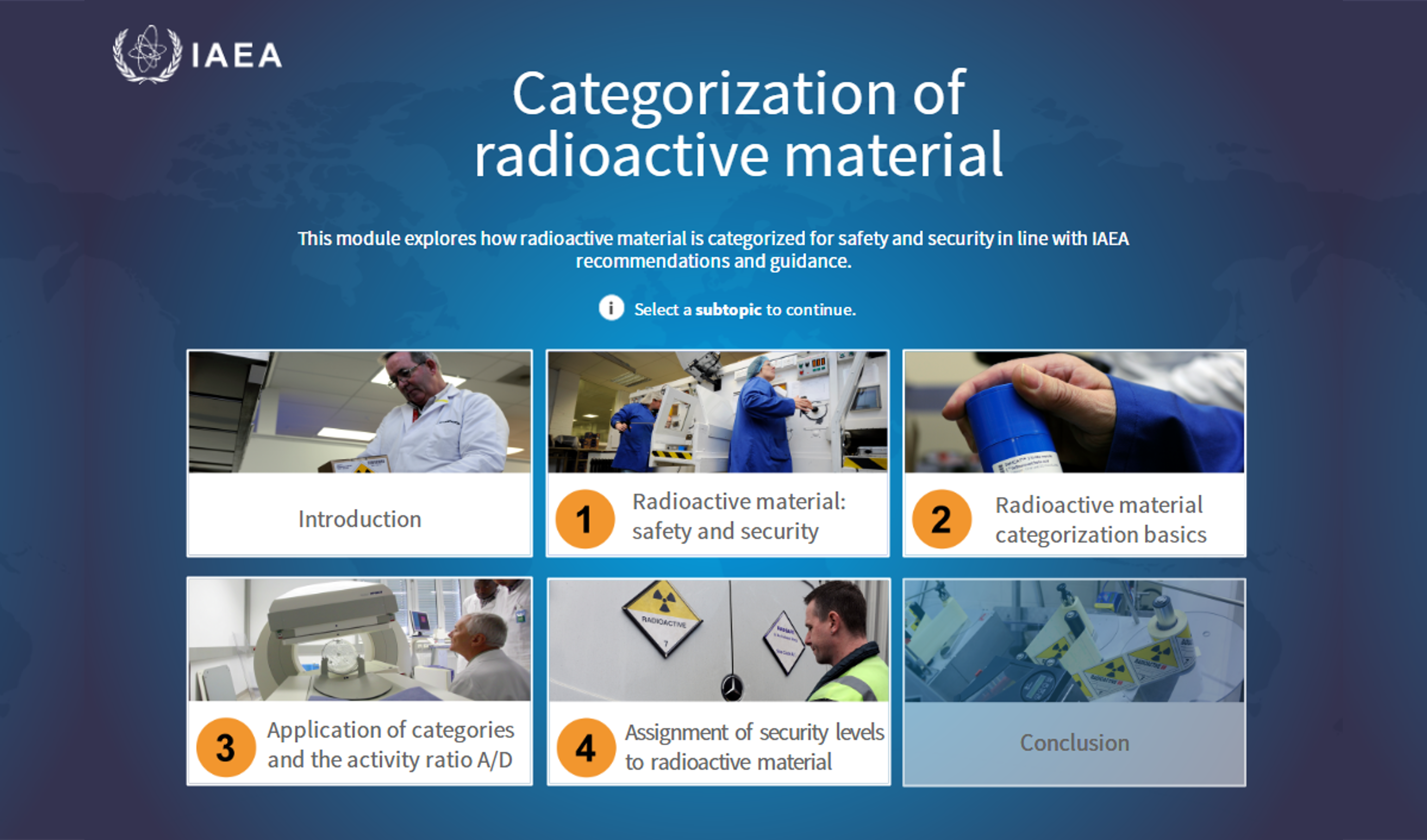 This course is designed to help learners understand the radioactive material categorization system described in the IAEA Safety Guide “Categorization of Radioactive Sources” No. RS-G-1.9 and how it applies to security. The learner will also understand how the categories of radioactive material are used to assign the requisite security levels. ??? ?????? ????????? ????? ??????? ????????? ??? ??? ???? ????? ?????? ?????? ??????? ?? ???? ?????? ??? RS-G-1.9 ?????? ?? IAEA "????? ??????? ??????" ?????? ?????? ??? ?????. ????? ??????? ????? ????? ??????? ???? ?????? ?????? ?????? ??????? ????? ????????. Este curso está dise?ado para ayudar a los alumnos a entender el sistema de categorización de materiales radiactivos descrito en la Guía de seguridad tecnológica del OIEA RS-G-1.9, Categorización de fuentes radiactivas, así como su relación con la seguridad física. Los alumnos entenderán también cómo se utilizan las categorías de materiales radiactivos para asignar los niveles de seguridad física requeridos. Cette formation est con?ue pour aider les apprenants à comprendre le système de catégorisation des matières radioactives décrit dans le Guide de s?reté n° RS-G-1.9 ? Catégorisation des sources radioactives ? de l’AIEA et la fa?on dont ce système s’applique à la sécurité. Elle décrit également la fa?on dont les catégories de matières radioactives sont utilisées pour affecter les niveaux de sécurité requis. Этот курс обучения помогает получить представление о системе категорирования радиоактивных материалов, описанной в Руководстве МАГАТЭ по безопасности RS-G-1.9 ?Категоризация радиоактивных источников?, и ее безопасном применении. Обучающийся также узнает о способах применения категорий радиоактивных материалов для присвоения соответствующих уровней физической безопасности. 本課程旨在幫助學員理解 IAEA 安全指南第 RS-G-1.9 號《放射源的分類》中描述的放射性物質分類系統以及如何將其應用于安保。學員還將了解如何使用放射性物質的類別來確定必要的安保級別。The audience for this course is intended to include regulatory bodies, governmental departments, or other competent authorities such as customs and border officers with responsibilities related to the security of radioactive material; manufacturers, producers, or importers of radioactive material and/or radioactive sources; and medical, agricultural, research, or industrial organizations that use radioactive material and/or radioactive sources. ????? ????? ??? ?????? ????????? ??????? ???????? ?? ???????? ???????? ?? ??????? ??????? ?????? ??? ????? ??????? ??????? ????? ??????? ????????? ????? ???? ?????? ??????? ????? ????? ?? ????? ?? ??????? ?????? ?????? ?/?? ??????? ??????? ????????? ?????? ?? ???????? ?? ??????? ?? ???????? ???? ?????? ?????? ?????? ?/?? ??????? ??????. Este curso está destinado a organismos reguladores, ministerios y otras autoridades competentes, como por ejemplo funcionarios de aduanas y de vigilancia fronteriza, que tengan algún cargo o responsabilidad en materia de seguridad física de materiales radiactivos, así como a fabricantes, productores o importadores de materiales o fuentes radiactivas y organizaciones médicas, agrícolas, industriales o de investigación que utilicen materiales o fuentes radiactivas. Cette formation est destinée aux organismes de réglementation, aux départements gouvernementaux ou aux autres autorités compétentes comme les agents des douanes et des frontières ayant des responsabilités liées à la sécurité des matières radioactives ; aux fabricants, aux producteurs ou aux importateurs de matières radioactives ou de sources radioactives ; et aux organisations médicales, agricoles, industrielles ou de recherche qui utilisent des matières ou des sources radioactives. К аудитории данного курса относятся сотрудники регулирующих органов, правительственных учреждений и других компетентных органов (например, служб таможенного и пограничного контроля), в обязанности которых входит обеспечение физической безопасности радиоактивных материалов; персонал производителей, изготовителей и импортеров радиоактивных материалов и/или радиоактивных источников; сотрудники медицинских, сельскохозяйственных, исследовательских и промышленных организаций, использующих радиоактивные материалы и/или радиоактивные источники. 本課程的受眾包括監管機構、政府部門或其他主管部門,例如負責放射性物質安保相關工作的海關和邊境官員;放射性物質和/或放射源的制造商、生產商或進口商;以及使用放射性物質和/或放射源的醫療、農業、研究或工業組織。Duration: 2 h 30 min | Interactivity: Self-study | Languages: English, Arabic, Spanish, French, Russian, Chinese | Certificate: Completion Certificate | Contact: nsnselearning@iaea.org????? :?????? ?30 ?????? | ?????? : ???? ???????? ??? ???????? | ?????: ???????? ??????????? ?????????? ????????? ???????? ??????? | ???????: ????? ????? | ???? ???????: nsnselearning@iaea.orgDuración: 2 h 30 min | Interactividad: Autoestudio | Idioma: árabe, inglés, espa?ol, francés, ruso, chino | Certificaci