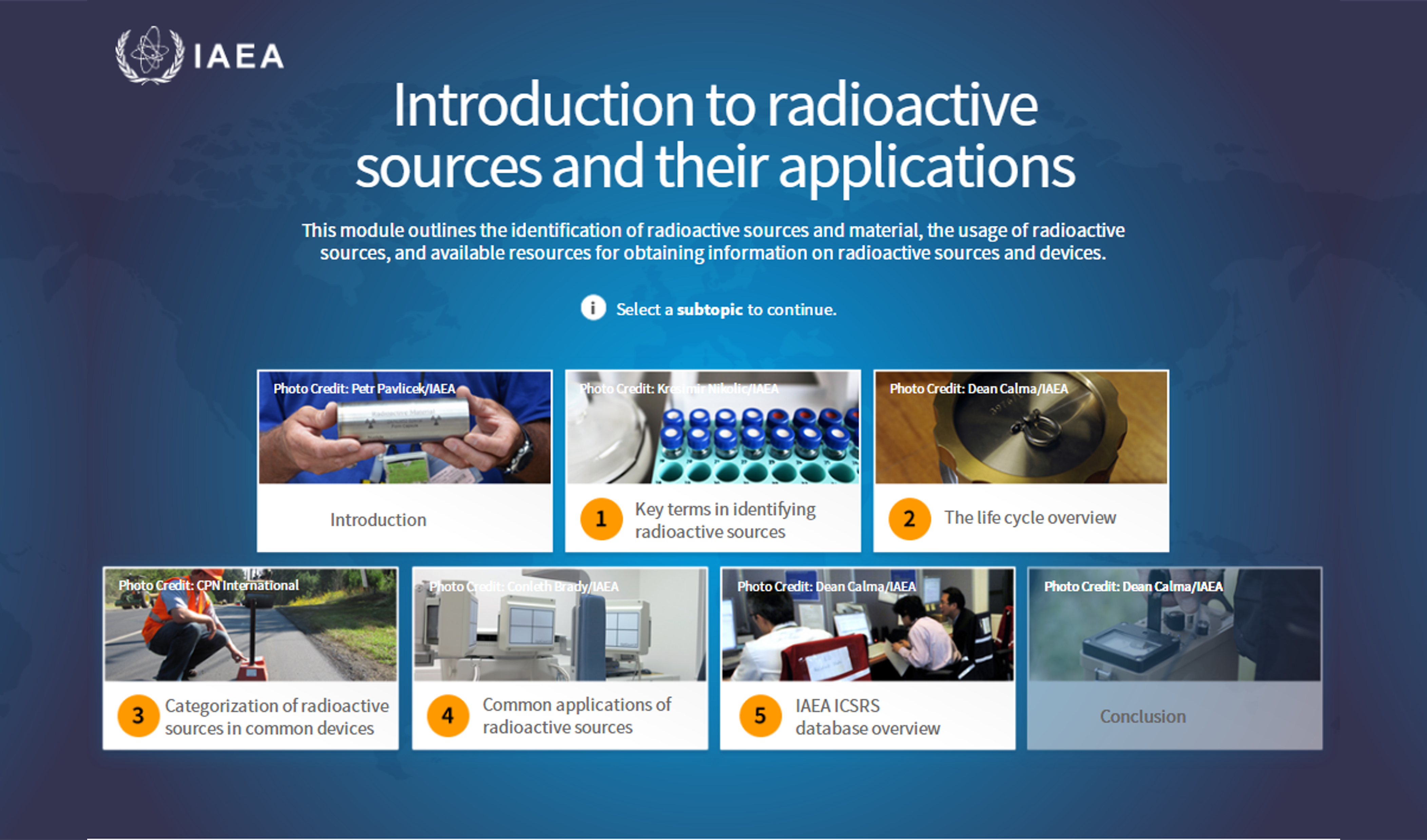 EnrolThis course is designed to help learners understand the common practices when using radioactive sources; understand tools for obtaining information on radioactive sources and devices; and understand key terms of this course. ??? ?????? ????????? ????? ??????? ????????? ??? ??? ????????? ??????? ??? ??????? ??????? ??????? ???? ????? ?????? ??? ??????? ?????? ???????? ???????? ??????? ???? ????????? ???????? ???? ?????? ?????????. Este curso está dise?ado para ayudar a los alumnos a comprender las prácticas comunes obligatorias a la hora de usar fuentes radiactivas, conocer las herramientas que permiten obtener información sobre fuentes y dispositivos radiactivos, y conocer los términos clave de este curso. Cette formation vise à aider les apprenants à comprendre les pratiques courantes qui ont recours à des sources radioactives?; à comprendre les outils qui permettent d’obtenir des informations sur les sources et dispositifs radioactifs?; et à comprendre les termes clés de cette formation. Этот курс электронного обучения помогает получить представление о наиболее распространенных вариантах применения радиоактивных источников, инструментах для получения информации о радиоактивных источниках и устройствах, а также ключевых терминах, упоминаемых в рамках модуля. 本課程將幫助學員了解使用放射源的一般實踐;了解獲取放射源和放射性裝置相關信息的可用工具;以及了解本課程涉及的關鍵術語。The audience for this course is intended to include regulatory bodies, governmental departments or other competent authorities such as customs and border officers with responsibilities related to the security of radioactive material; manufacturers, producers, or importers of radioactive material and/or radioactive sources; and medical, agricultural, research, or industrial organizations that use radioactive material and/or radioactive sources. ?? ?????? ?? ????? ????? ??? ?????? ????????? ??????? ???????? ?? ???????? ???????? ?? ??????? ??????? ?????? ??? ????? ??????? ??????? ????? ??????? ????????? ????? ???? ?????? ??????? ?????? ?? ????? ?? ??????? ?????? ?????? ?/?? ??????? ??????? ????????? ?????? ?? ???????? ?? ??????? ?? ???????? ???? ?????? ?????? ?????? ?/?? ??????? ??????. Este curso está destinado a organismos reguladores, ministerios y otras autoridades competentes, como funcionarios de aduanas y de vigilancia fronteriza, que tengan algún cargo o responsabilidad en materia de seguridad física de materiales radiactivos, así como a fabricantes, productores o importadores de materiales y/o fuentes radiactivas y organizaciones médicas, agrícolas, industriales o de investigación que utilicen materiales o fuentes radiactivas. Cette formation est destinée aux organismes de réglementation, aux départements gouvernementaux ou aux autres autorités compétentes comme les agents des douanes et des frontières ayant des responsabilités liées à la sécurité des matières radioactives?; aux fabricants, aux producteurs ou aux importateurs de matières radioactives ou de sources radioactives?; et aux organisations médicales, agricoles, industrielles ou de recherche qui utilisent des matières radioactives ou des sources radioactives. К аудитории данного курса относятся сотрудники регулирующих органов, правительственных учреждений и других компетентных органов, например сотрудники таможенных органов и пограничного контроля, обязанности которых связаны с обеспечением физической безопасности радиоактивных материалов, персонал производителей, изготовителей и импортеров радиоактивных материалов и/или радиоактивных источников и сотрудники медицинских, сельскохозяйственных, исследовательских и промышленных организаций, использующих радиоактивные материалы и/или радиоактивные источники. 本課程的受眾包括監管機構、政府部門或其他主管部門,例如負責放射性物質安保相關工作的海關和邊境官員;放射性物質和/或放射源的制造商、生產商或進口商;以及使用放射性物質和/或放射源的醫療、農業、研究或工業組織。Duration: 2 h 30 min | Interactivity: Self-study | Languages: English, Arabic, Spanish, French, Russian, Chinese | Certificate: Completion Certificate | Contact: nsnselearning@iaea.org ?????? :?????? ?30 ?????? | ?????? : ???? ???????? ??? ???????? | ?????: ???????? ??????????? ?????????? ????????? ???????? ??????? | ???????: ????? ????? | ???? ???????: nsnselearning@iaea.orgDuración: 2 h 30 min | Interactividad: Autoestudio | Idioma: árabe, inglés, espa?ol, francés, ruso, chino | Certificación: Certificado de participación | Contacto: nsnselearning@iaea.org ??Durée: 2h30 | Interactivité: Autoformation | Langue: Arabe, anglais, espagnol, fran?ais, russe, chinois | Certification: Certificat d’achèvement | Point de contact: nsnselearning@iaea.org?Продолжительность: 2?ч 30?мин?| Интерактивность: Самообучение | Язык: Арабский, английский, испанский, французский, русский, китайский | Сертификация: Сертификат о прохождении | Контактное лицо: nsnselearning@iaea.org ??持續時間: 2 小時 30 