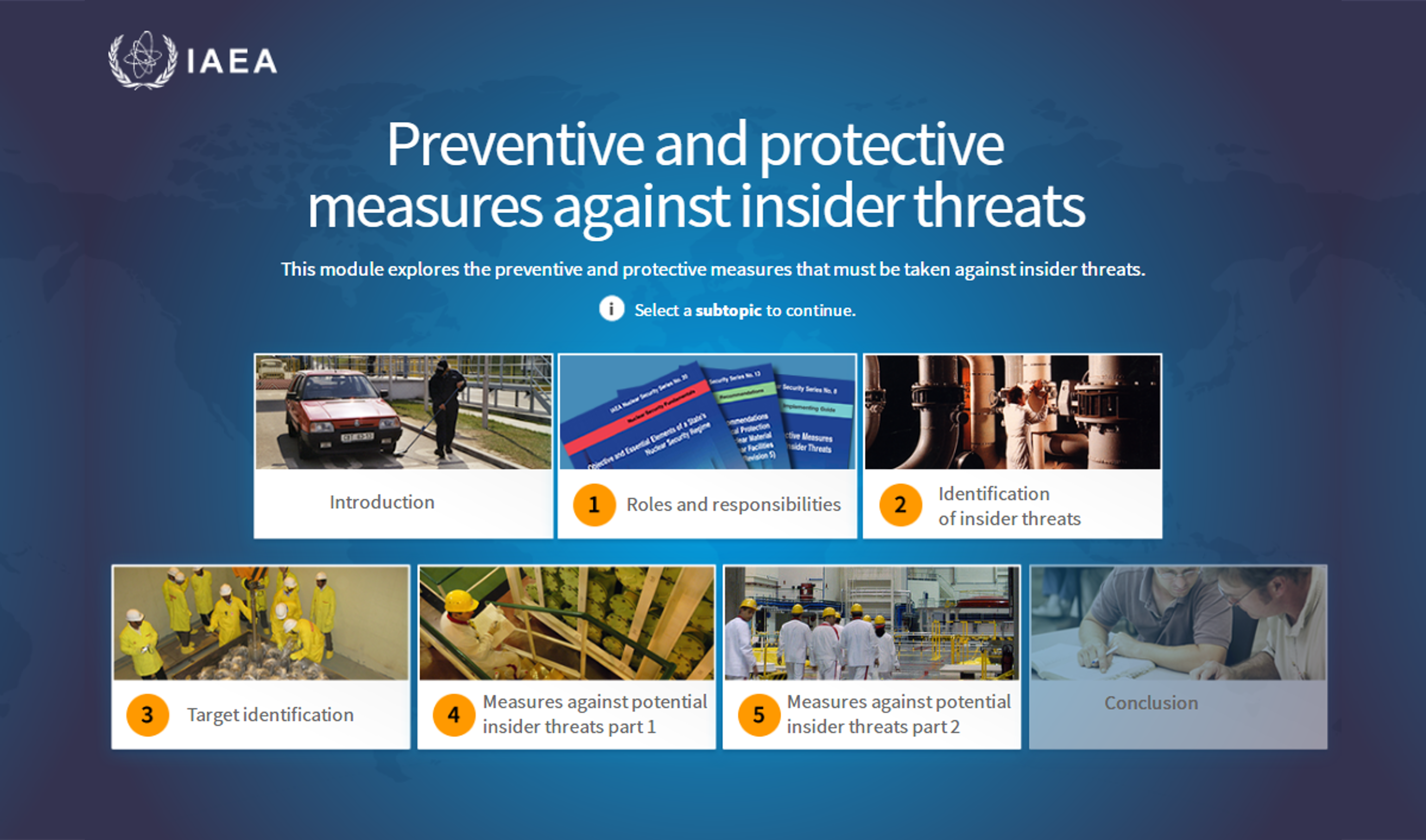 This course is designed to provide learners with an overview of the NSS No. 8 Implementing Guide "Preventive and Protective Measures against Insider Threats". After completing the course, learners will have a clear understanding of the importance of addressing the insider threat. Learners will recognize the roles and responsibilities of different entities for addressing insider threats, get acquainted with the key terms used to characterize insiders and their targets, understand what constitutes a preventive and protective measure, and recognize contingency and implementation measures.??? ?????? ????????? ????? ?????? ????????? ????? ???? ??? ???? ??????? ??? 8 ?? ????? NSS "?????? ??????? ???????? ?? ??????? ??????? ????????". ??? ??????? ?????? ?????????? ????? ??? ????????? ??? ???? ?????? ??????? ?? ??????? ??????? ????????. ?????? ????????? ??? ??????? ??????????? ?????? ?????? ???????? ??????? ?? ??????? ??????? ????????? ????????? ??? ????????? ???????? ????????? ?????? ??????? ???????? ????????? ???????? ?????? ?????? ??????? ???????? ????????? ??? ?????? ??????? ????????.Este curso está ideado para proporcionar una descripción general de la Guía de Aplicación NSS?n.o?8, “Preventive and Protective Measures Against Insider Threats”. Cuando hayan terminado este curso, los alumnos comprenderán claramente la importancia que tienen las medidas contra las amenazas de agentes internos. Los alumnos aprenderán a identificar los roles y responsabilidades de las diferentes entidades responsables de tratar las amenazas de los agentes internos, se familiarizarán con los términos clave utilizados para caracterizar a los agentes internos y sus blancos, comprenderán lo que son medidas preventivas y de protección, y conocerán las medidas de contingencia e implementación.Cette formation vise à fournir aux apprenants une présentation générale du guide d’application NSS no?8 ??Mesures de prévention et de protection contre les menaces internes??. Après avoir terminé cette formation, les apprenants disposeront d’une compréhension claire de l’importance de la prise en compte des menaces internes. Ils conna?tront les r?les et les responsabilités des différentes entités intervenant dans la réponse aux menaces internes, se familiariseront avec les principaux termes utilisés pour caractériser les malveillants internes et leurs cibles, comprendront ce qui constitue une mesure de prévention et de protection, et identifieront les mesures d’intervention et de mise en ?uvre.Этот курс представляет собой ознакомительный обзор Практического руководства №?8 из серии изданий по физической ядерной безопасности МАГАТЭ ?Предупредительные и защитные меры в отношении угроз, исходящих от внутреннего нарушителя?. После завершения данного курса учащиеся будут иметь четкое представление о том, насколько важно уделять надлежащее внимание угрозам, исходящим от внутреннего нарушителя. Учащиеся узнают роли и зоны ответственности различных организаций, в соответствии с которыми необходимо уделять надлежащее внимание угрозам, исходящим от внутреннего нарушителя, ознакомятся с ключевыми терминами, используемыми для характеристики внутренних нарушителей и их целей, поймут, что такое предупредительные и защитные меры, а также научатся различать чрезвычайные меры и меры реализации.本課程將向學員概述《核安保叢書》第 8 號實施指南《針對內部人員威脅的預防和保護措施》。完成本課程的學習后,您將對解決內部人員威脅的重要性有明確的了解。學員將認識到不同實體在解決內部人員威脅方面的角色和責任,熟悉用于描述內部人員及其目標的特性的關鍵術語,了解預防和保護措施包含哪些內容,以及識別應急和實施措施。The course is intended mainly for persons who are responsible for designing, operating and/or assessing nuclear security systems, including the nuclear material accounting and control (NMAC) components, physical protection of nuclear facilities, and nuclear security management and staff; operators and managers of NMAC systems; those preparing associated regulations; persons responsible for computer security at nuclear facilities; and persons from the competent authorities and related law enforcement agencies. ?????? ????????? ????? ???? ????? ??????? ????????? ?? ????? ?/?? ????? ?/?? ????? ????? ????? ??????? ??? ?? ??? ?????? ??? ??? ?????? ??????? ????????? (NMAC) ???????? ??????? ??????? ???????? ?????? ????? ??????? ????? ??? ????? NMAC ?????? ??? ??????? ????????? ???????? ????? ?????? ?????? ??????? ??? ?????? ???????? ????????? ?? ????? ???????? ?? ??????? ???????? ???????? ???????? ?? ??????? ??????? ??????? ????? ??????? ??? ?????. Este curso está dirigido principalmente a personas responsables de dise?ar, gestionar y/o evaluar sistemas de seguridad física nuclear, incluidos los componentes de contabilidad y control de materiales nucleares (NMAC), protección física de instalaciones nucleares, empleados y personal de seguridad física nuclear, así como a operadores y responsables de sistemas NMAC, responsables de elaborar la legislación pertinente, responsables de la seguridad informática en instalaciones nucleares y personal tanto de las autoridades competentes como de los cuerpos y fuerz