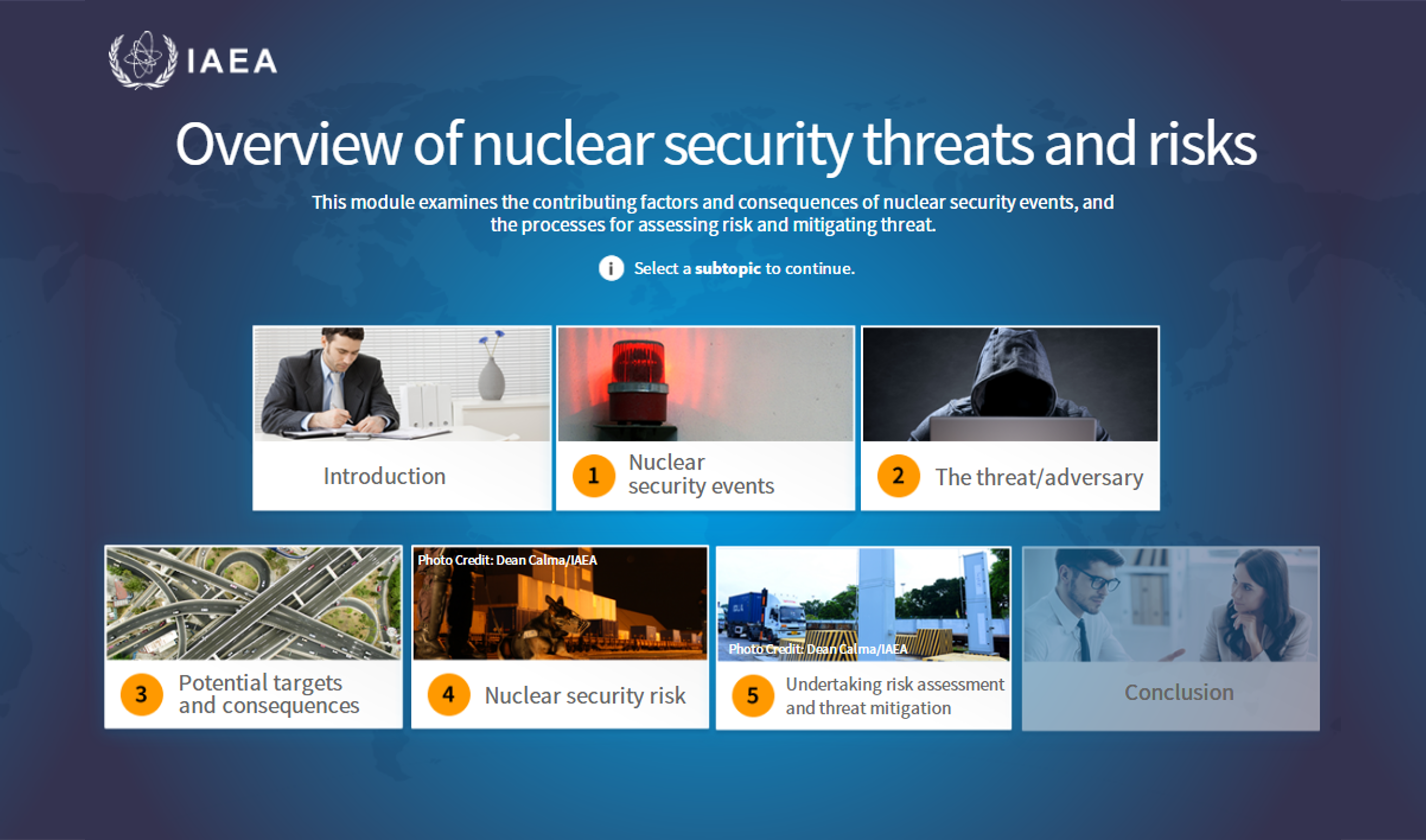 This e-learning module is designed to provide a basic introduction to nuclear security threats and risks through exploring the following: nuclear security events; threat / adversaries ; potential targets and consequences; nuclear security risk; understanding risk assessment and threat mitigation. ??? ??? ????? ?? ??????? ?????????? ?????? ????? ?????? ??? ????????? ???????? ???????? ?????? ?????? ?? ???? ??????? ?? ???: ????? ????? ??????? ??????? / ??????? ??????? ???????? ????????? ????? ????? ??????? ??? ????? ??????? ?????? ?????????. Este módulo de aprendizaje electrónico está dise?ado para proveer una introducción básica a las amenazas y los riesgos para la seguridad física nuclear explorando lo siguiente: sucesos de seguridad física nuclear; amenazas / adversarios; posibles blancos y consecuencias; riesgos para la seguridad física nuclear; cómo comprender la evaluación de riesgos y la mitigación de amenazas. Ce module de formation en ligne présente une introduction générale aux menaces et aux risques pour la sécurité nucléaire en s’attardant sur les points suivants : les événements de sécurité nucléaire ; la menace/l’adversaire ; les cibles et les conséquences potentielles ; le risque lié à la sécurité nucléaire ; comprendre l’évaluation du risque et l'atténuation de la menace. Предлагаемый модуль электронного обучения позволит ознакомиться с факторами угрозы и риска нарушения физической ядерной безопасности путем изучения событий, связанных с физической ядерной безопасностью, видов угроз и нарушителей, вероятных целей и последствий, факторов риска нарушения режима физической ядерной безопасности, а также осознания процессов оценки риска и ослабления действия угроз. 該電子學習模塊旨在通過探討以下內容提供核安保威脅和風險的基本介紹:核安保事件;威脅/敵對分子;潛在目標和后果;核安保風險;了解風險評價和降低威脅。The audience for this course is intended to include all personnel and organizations with nuclear security responsibilities and functions. This includes, but is not limited to: national security authorities, regulatory bodies, national nuclear security coordinators, law enforcement, customs, intelligence and security agencies, operators, technical support organizations, educational and training organizations, and nuclear security support centres. ?? ?????? ?? ???? ????? ??? ?????? ???? ??????? ????????? ????? ??????? ????????? ?????? ?? ????? ??????. ????? ???? ??? ???? ?????? ?? ?????: ????? ????? ??????? ??????? ???????? ????? ????? ?????? ??????? ????? ????? ???????? ???????? ?????? ??????????? ??????? ????? ???????? ?????? ????? ?????? ?????? ??????? ????????? ?????? ??? ????? ??????. El público deseado para este curso incluye todo personal y todas las organizaciones con responsabilidades y funciones relacionadas con la seguridad física nuclear. Esto incluye, pero no se limita a: las autoridades de seguridad nacional, organismos reguladores, coordinadores nacionales de seguridad física nuclear, fuerzas del orden público, aduanas, agencias de inteligencia y seguridad, operadores, organizaciones de respaldo técnico, organizaciones educativas y de capacitación así como centros de respaldo de seguridad física nuclear. Cette formation s’adresse à l'ensemble du personnel et des organisations ayant des responsabilités et des fonctions en matière de sécurité nucléaire. Sont donc notamment inclus : les autorités nationales de sécurité ; les organismes de réglementation ; les coordonnateurs de la sécurité nucléaire nationale ; les organismes d'application de la loi, des douanes, de renseignement et de sécurité ; les exploitants ; les organismes de soutien technique ; les organismes d’éducation et de formation ; et les centres de soutien en sécurité nucléaire. В состав слушателей предлагаемого курса следует включать всех сотрудников и все организации, несущие ответственность и выполняющие функции в сфере обеспечения физической ядерной безопасности. Сюда относятся, в частности, государственные службы обеспечения безопасности, органы нормативного регулирования, национальные координаторы мероприятий по обеспечению физической ядерной безопасности, правоохранительные органы, таможенные службы, разведывательные службы и агентства безопасности, эксплуатационные предприятия, организации технической поддержки, образовательные и учебные учреждения и центры обеспечения физической ядерной безопасности. 本課程的受眾應包括承擔核安保職責和職能的所有人員和組織。其包括但不限于:國家安保機構、監管機構、國家核安保協調員、執法機構、海關、情報和安保機構、營運人、技術支持組織、教育和培訓組織以及核安保支持中心。Duration: 3 h | Interactivity: Self-study | Languages: English, Arabic, Spanish, French, Russian, Chinese | Certificate: Completion Certificate | Contact: nsnselearning@iaea.org ?????? :3 ?????? | ?????? : ???? ???????? ??? ???????? | ?????: ???????? ??????????? ?????????? ????????? ?????