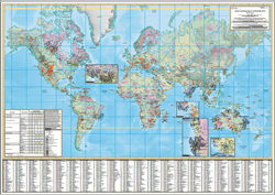 The World Distribution of Thorium Deposits map, at a scale of 1:35 000 000, is intended to be a snapshot of the IAEA ThDEPO database showing the broad distribution of thorium resources worldwide. The map displays the Thorium deposit-type classification system and deposit size ranges.