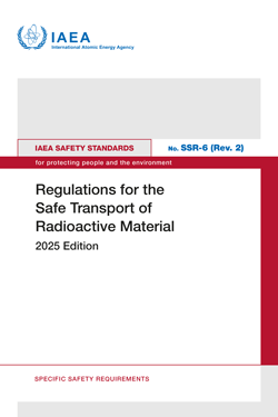 IAEA Safety Standards, Transport of Radioactive Material, 2025 Edition, IAEA Safety Standards Series No. SSR-6, Worldwide Implementation, Land Transport, Water Transport, Air Transport, Packaging Design, Manufacture, Maintenance, Repair, Preparation, Consigning, Loading, Carriage, In-Transit Storage, Shipment, Unloading, Receipt, Final Destination, UN Model Regulations, IMDG Code, ICAO Technical Instructions, Globally Implemented, Mandatory, National Government, National Transport Safety Regulations, Shipments on Land, Radioactive Substances, Transportation, Safety Measures, Security Measures